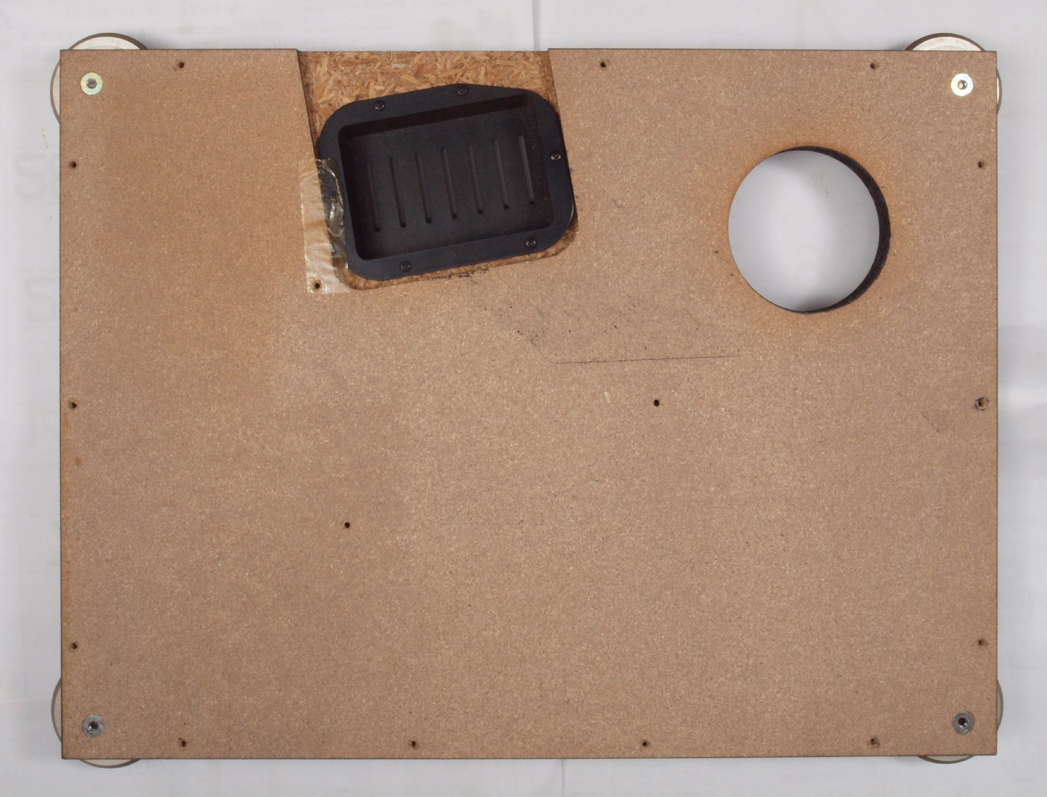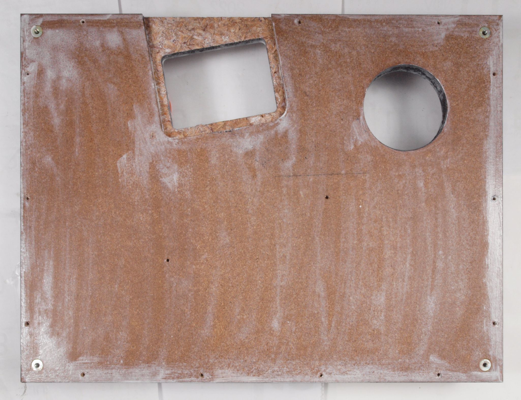 | W45. 修理中 本体木枠下後。 圧縮材にボンドを染みこませる、ネジ穴も塗る。 | ||||||||||||||||||||||||