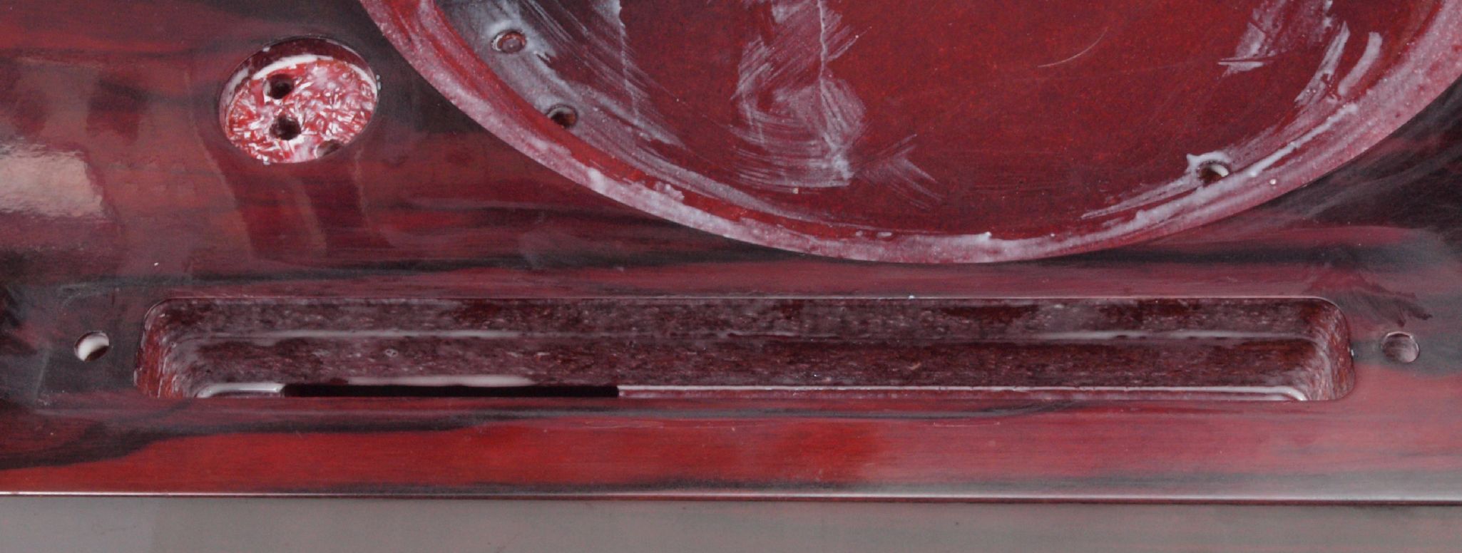 | WA5. 修理中 下蓋のアーム取り付穴、反対側。ボンドを染みこませる、ネジ穴も塗る。 | ||||||||||||||||||||||||