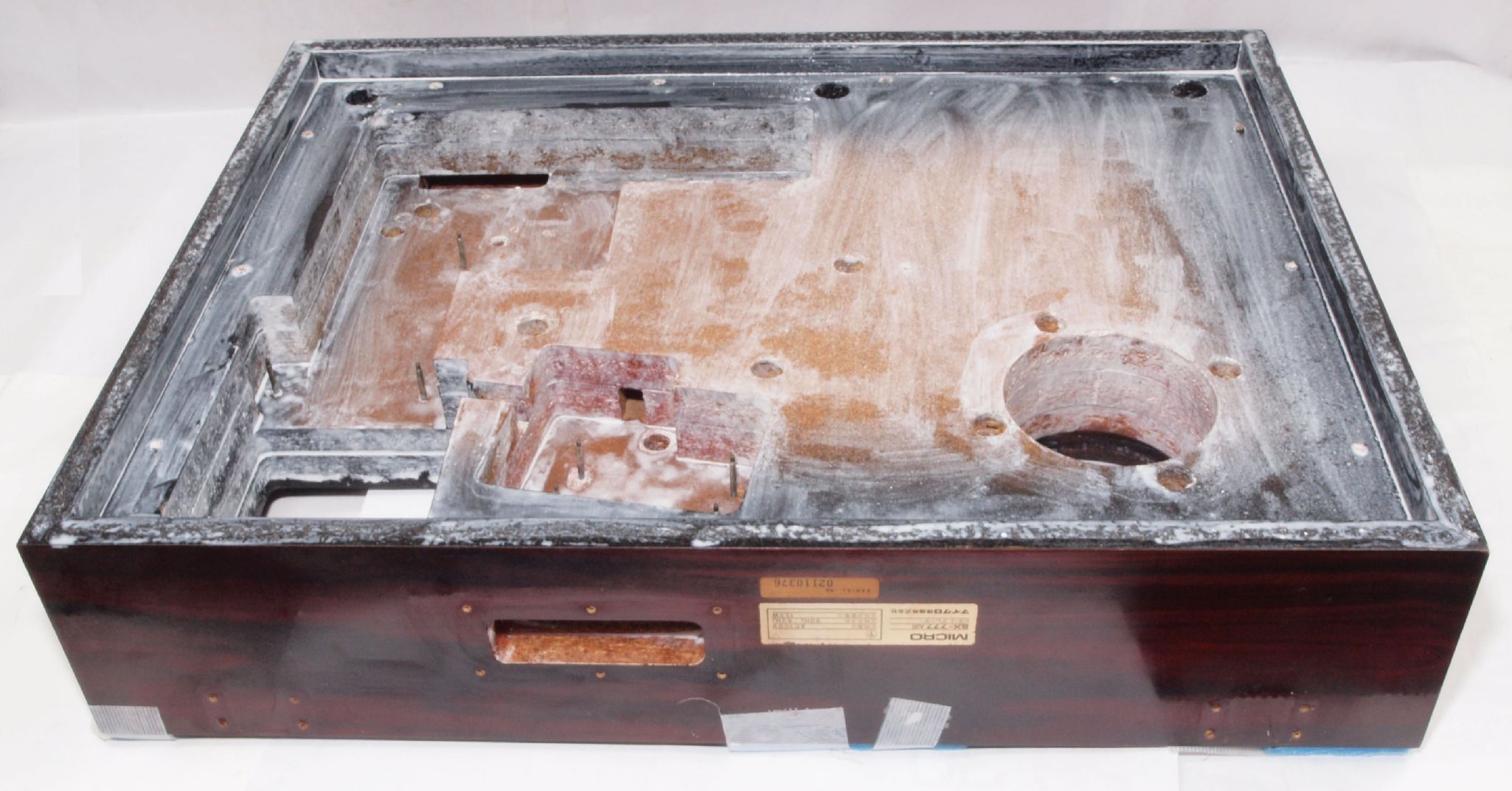| W. 下蓋及び本体木部 修理状況。 画像をクリックすると、大きく(横幅2050ドット)表示されます。 W1. 修理前 モーター、基板、アーム架台を取り本体上から。 |