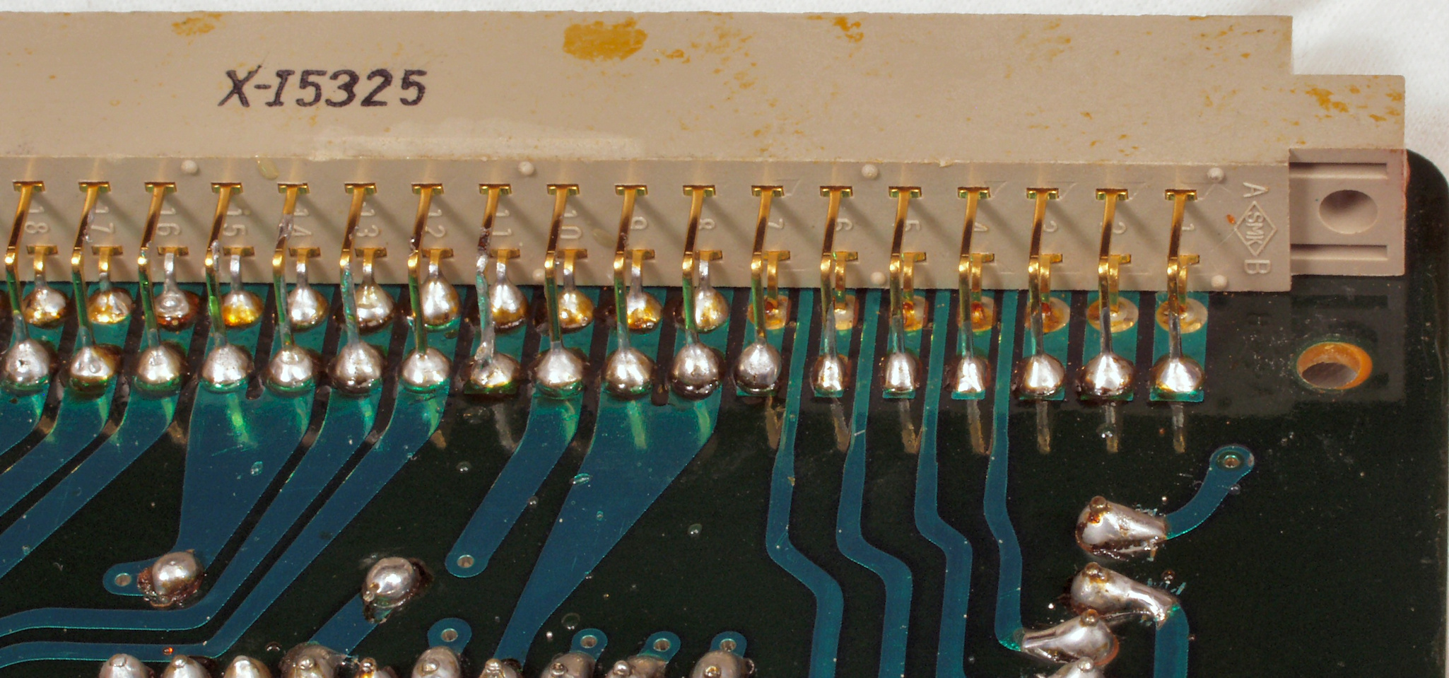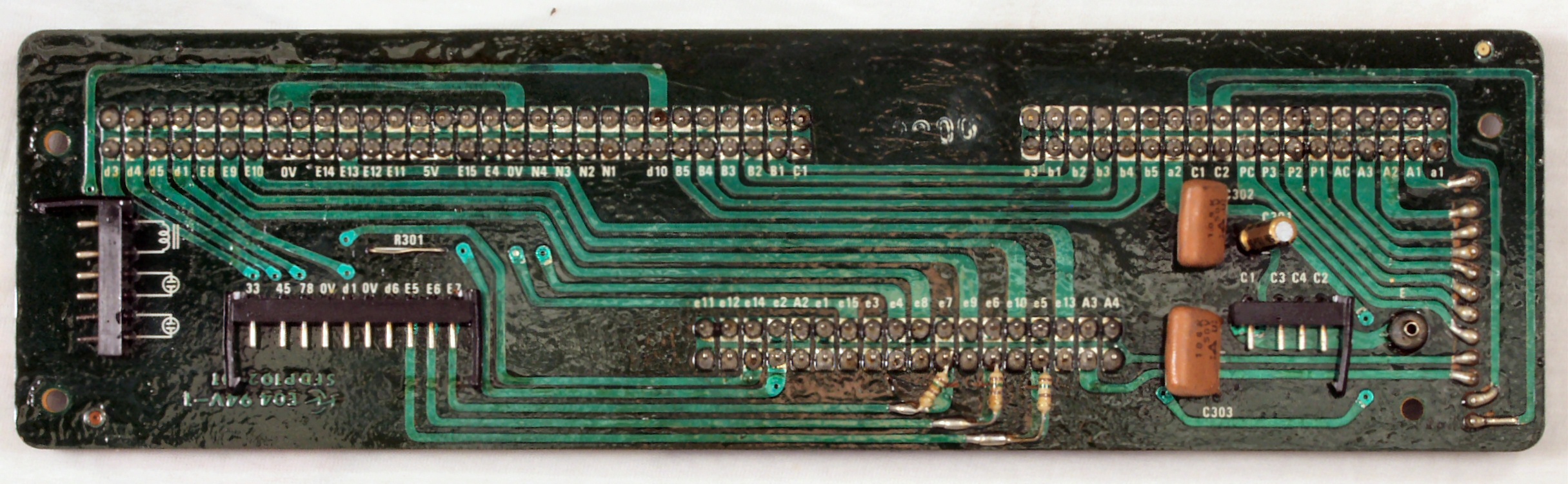 | C45. 修理(半田補正)後 基準発生・速度切替え分周基板裏。全ハンダをやり直す。 | ||||||||||||||||||||||||||||||