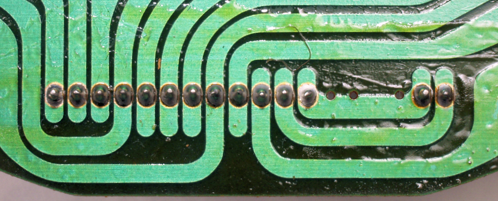 | C232. 修理前 定電圧回路基板裏、電解コンデンサーの液漏れで腐食した銅箔。 | ||||||||||||||||||||||||||||||||||||||