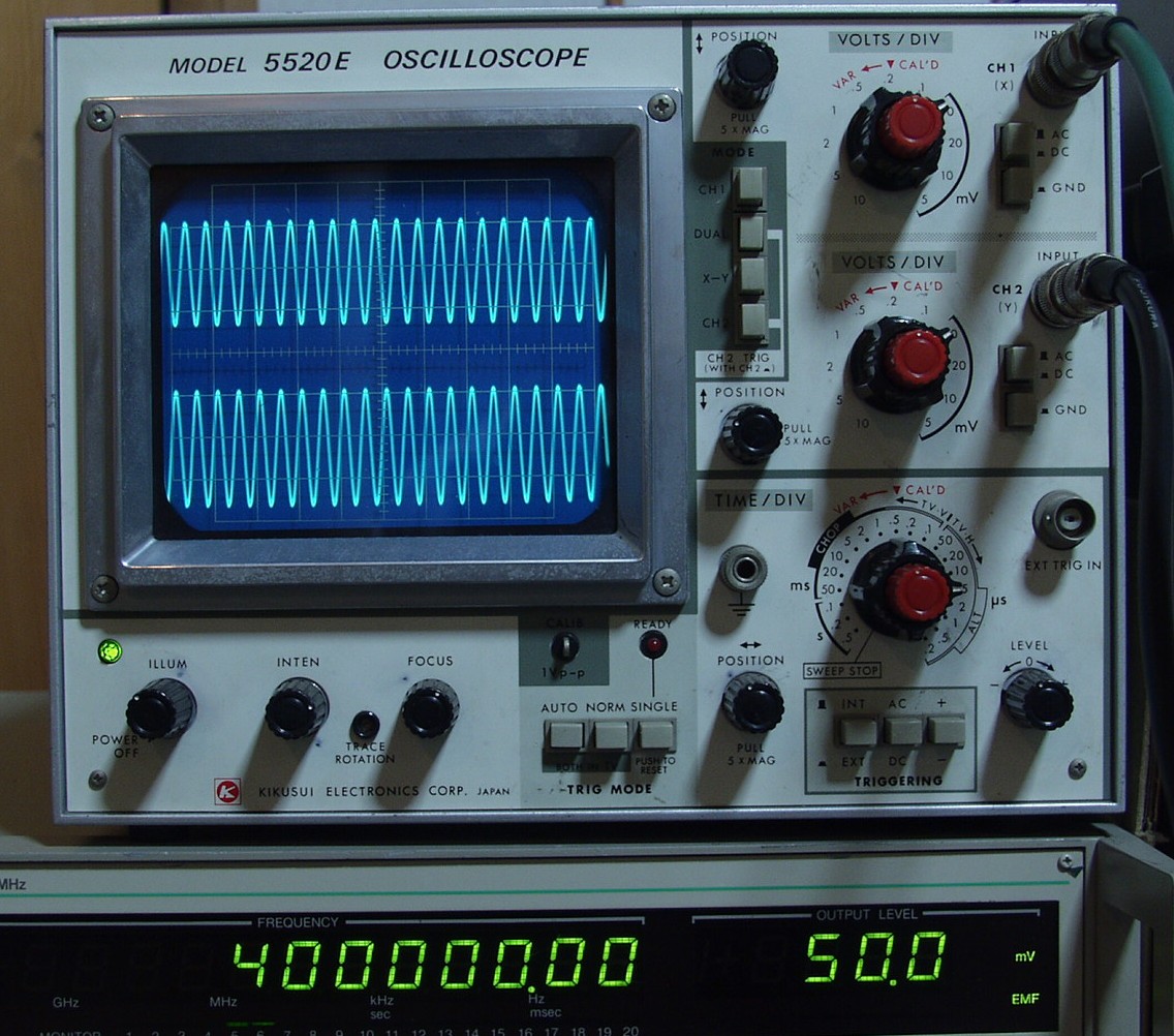 E−1. ネットワークアナライザーが無いので、下のSGより信号を入れ同時に上のオシロに入力