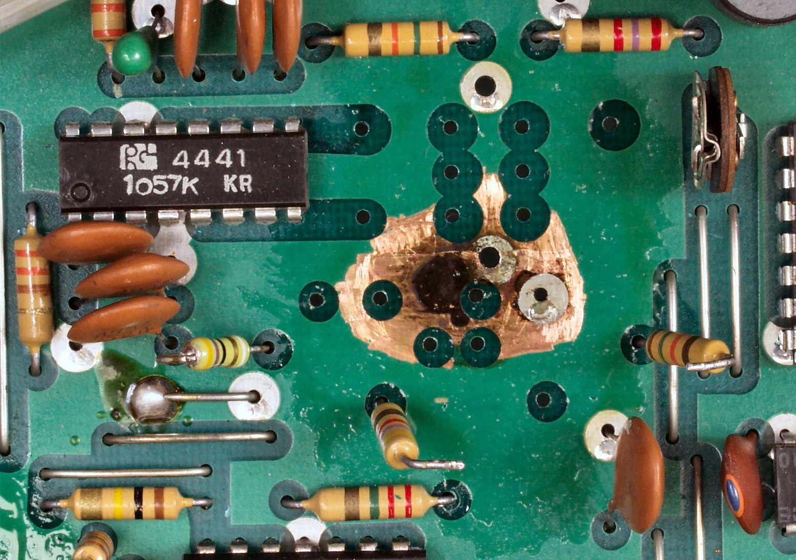 | C22. 修理中 基板腐食ケ所2、部品を外し、銅箔を出す。IFTコイルの下まで及んでいる。 | ||||||||||||||||||||||||||||||||||||||||||||||||