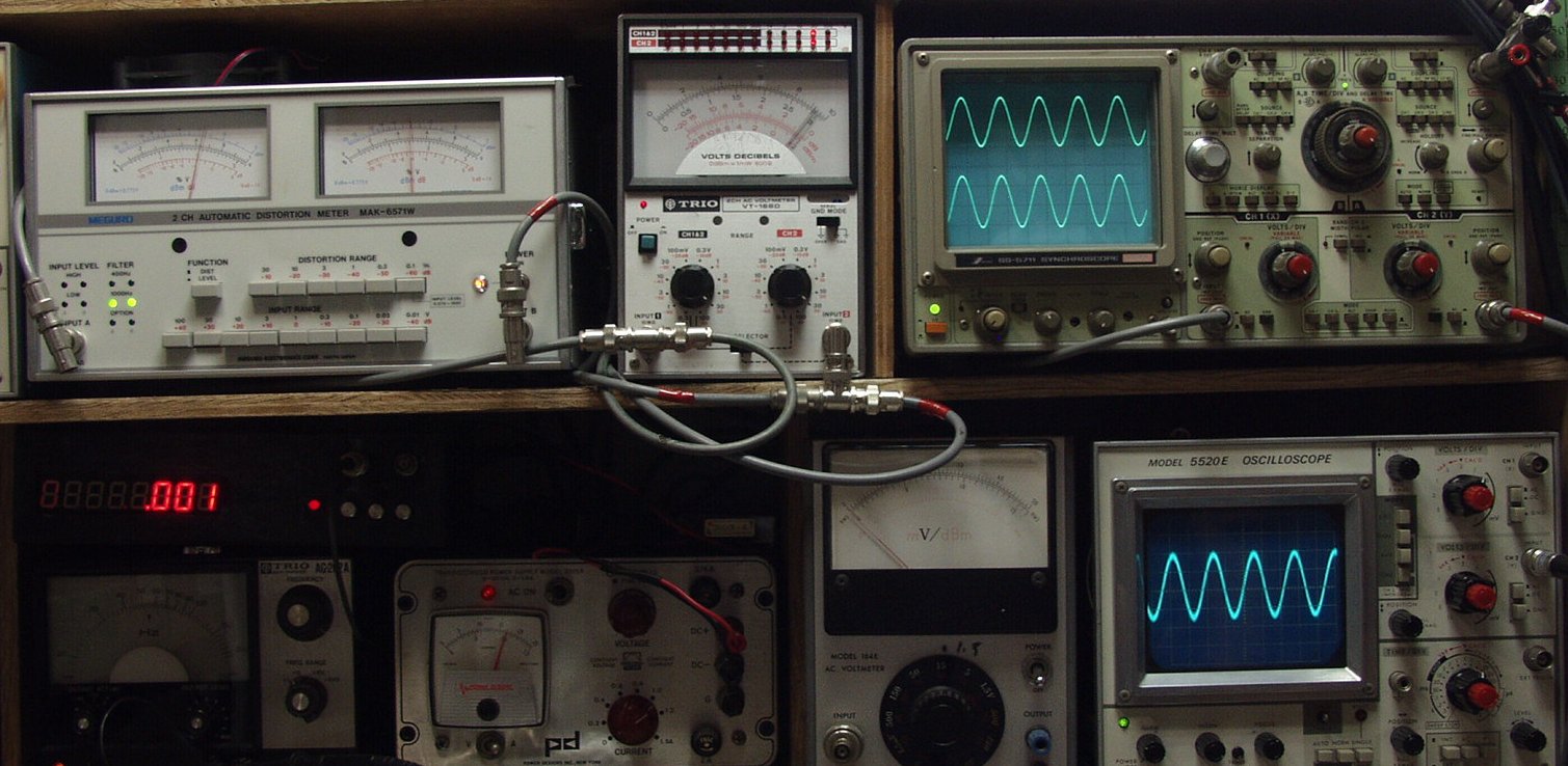 | 16.29V=105W/8Ω 歪み率=0.06% at=400HZ MM端子入力 右=赤針=上、左=黒針=下、右下オシロ=入力波形 |