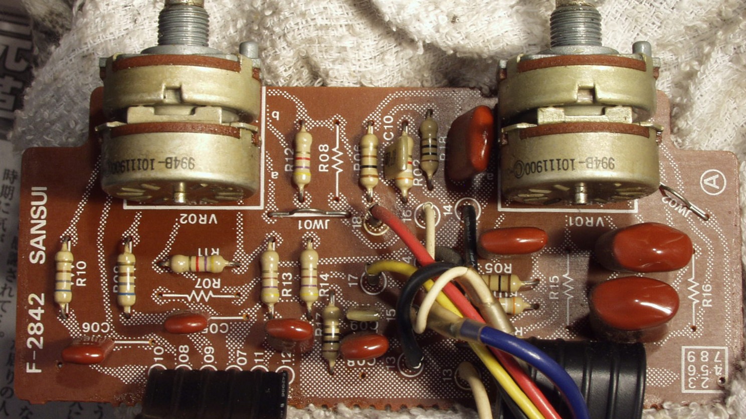 C−6B. 修理後 EQ基板 初段FET(電界効果トランジスター)2個、半固定VR2個、電解コンデンサー20個交換