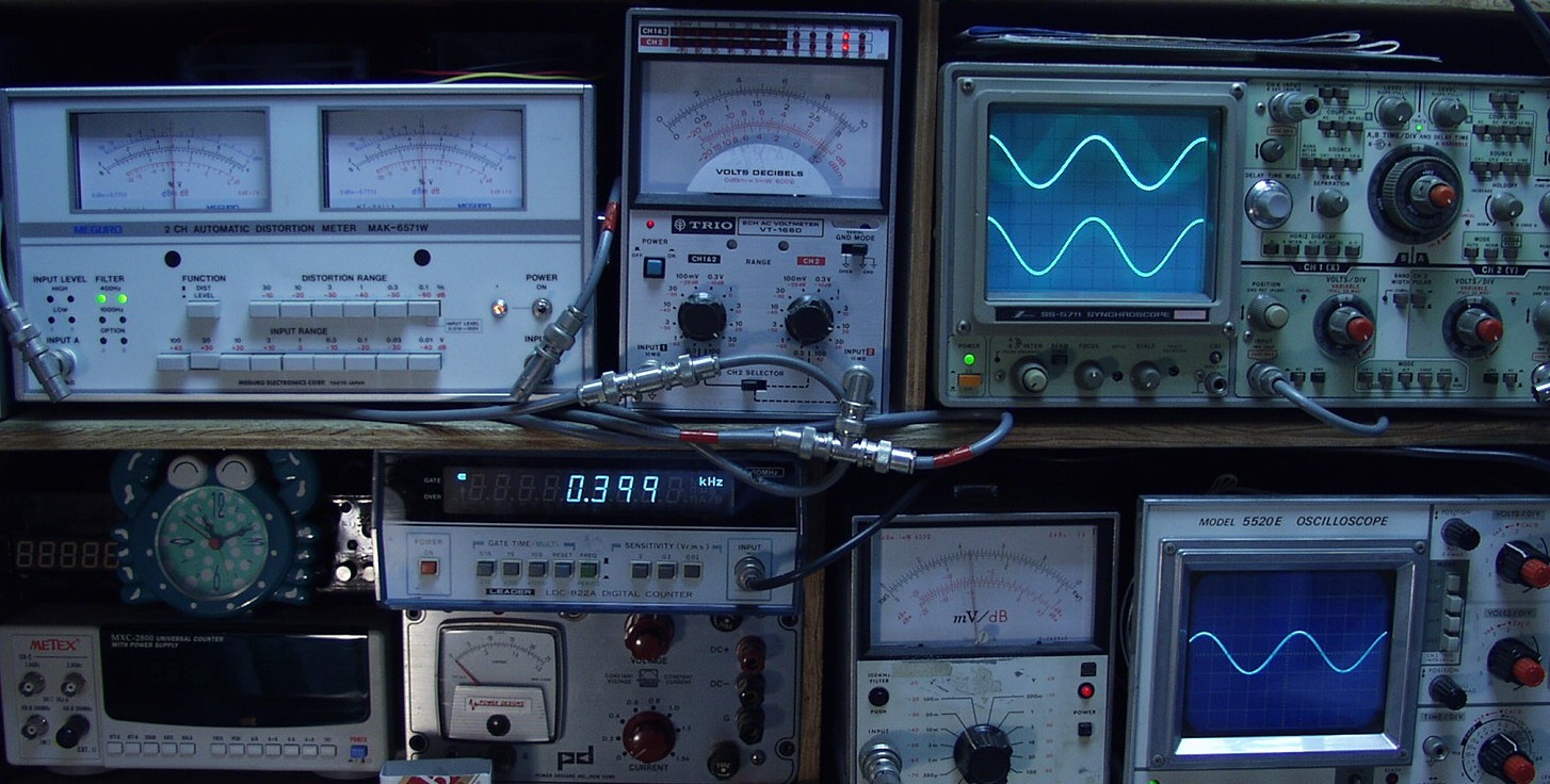E−4B. 出力/歪み率測定・調整  出力=28V=98W 歪み率0.05% at=400HZ MC端子入力