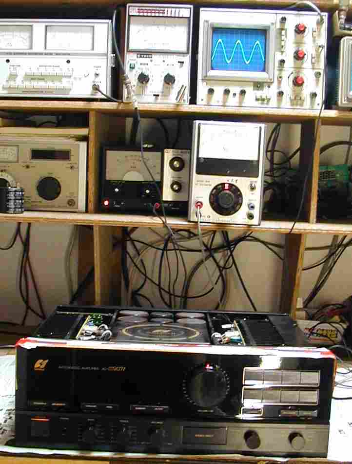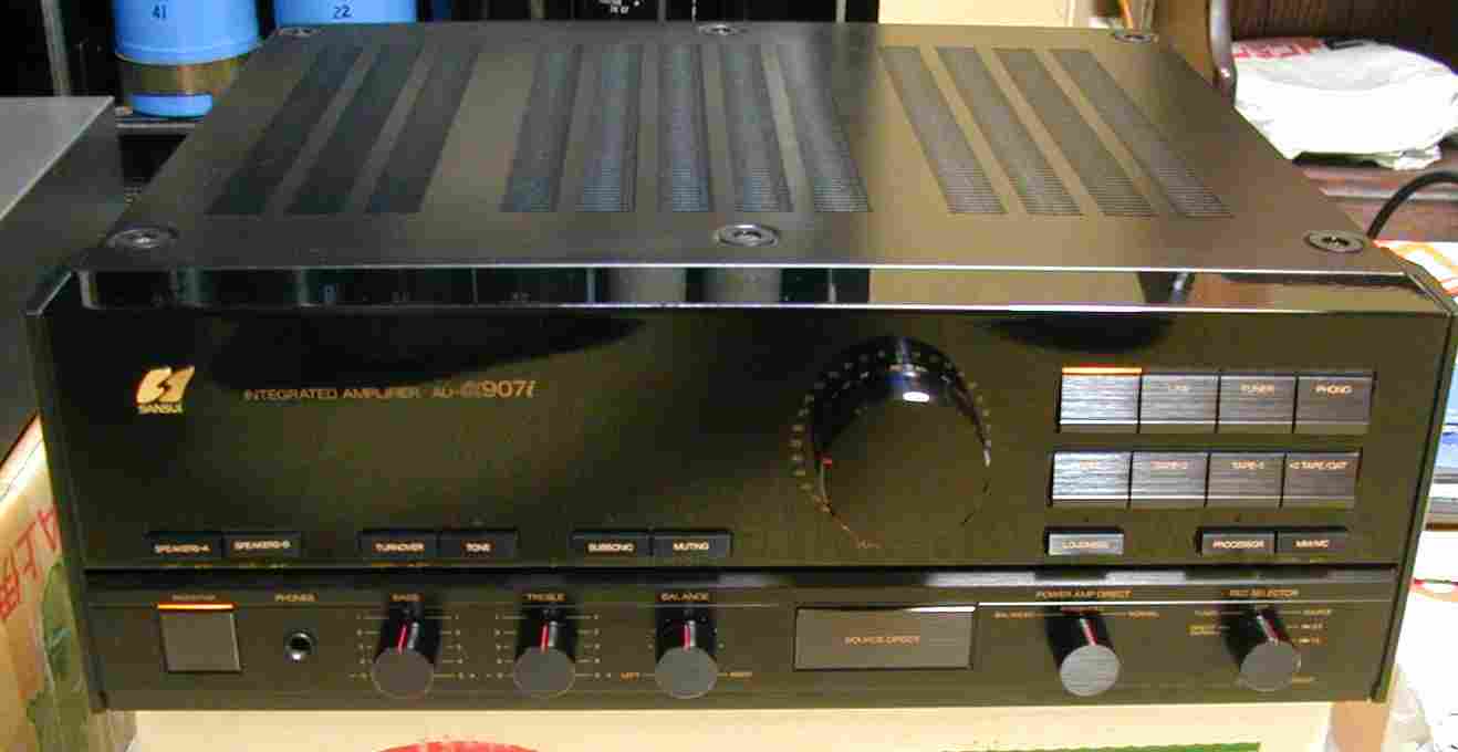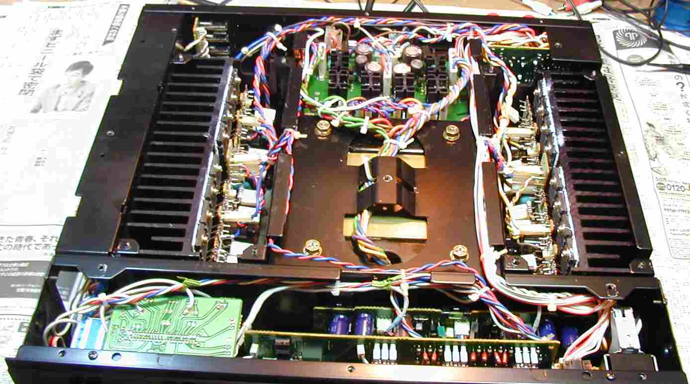 | A.修理前の状況 完全オーバーホール。 B.原因 各部劣化の復元 C.修理状況 SP接続リレー交換 メインAMPバイアス/バランス半固定VR交換 終段TR(トランジスター)交換 メインAMP初段FET(電界効果トランジスター)交換 コントロールAMP初段FET(電界効果トランジスター)交換 EQAMP初段FET(電界効果トランジスター)交換 各AMP電源コンデンサー交換 配線手直し、補強 RL側板修理 D.使用部品 SP接続リレー 2個 半固定VR 12個 終段TR(トランジスター) 8個 メインAMP初段FET(電界効果トランジスター) 2個 コントロ−ルAMP初段FET(電界効果トランジスター) 4個 EQAMP初段FET(電界効果トランジスター) 4個 電源コンデンサー 12個 E.修理費 49,000円 通常修理。 S. Sansui AU−α907i の仕様(マニアルより) |