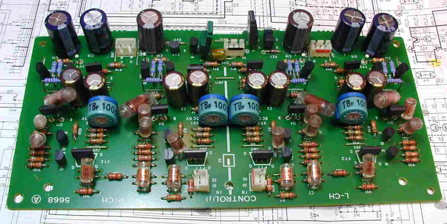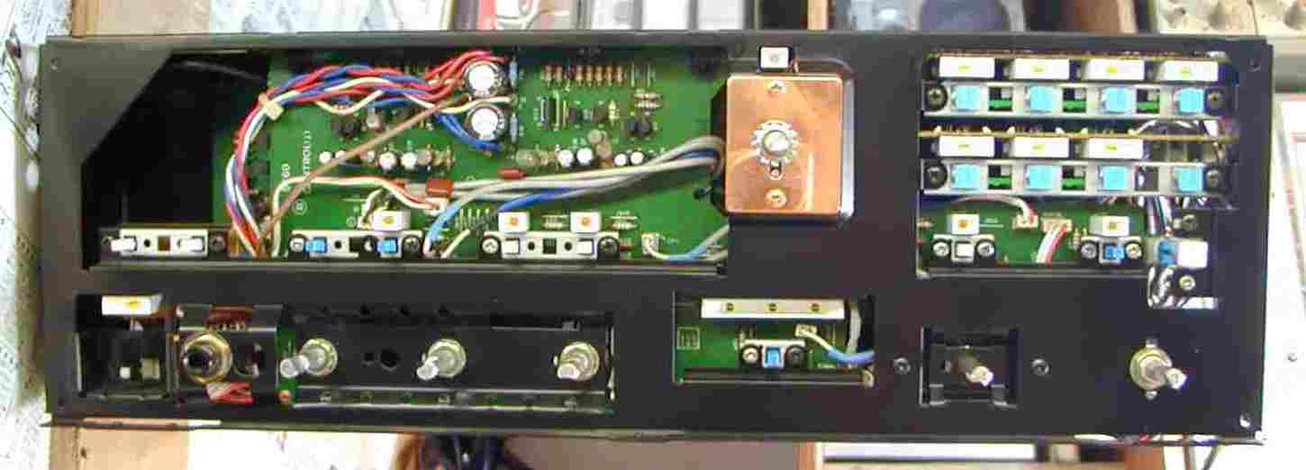 | 2.修理後の片側メインAMP基板。 下に8個付いているのが、終段TR(トランジスター)損失=180Wに交換、 これで、増幅率も上がり前段が楽になる。 上、左右の電源コンデンサー=470μ/100V/105度に交換、是で寿命が格段に延びる。 4個の半固定VRも13φ密閉型(金メッキ足)に交換 |