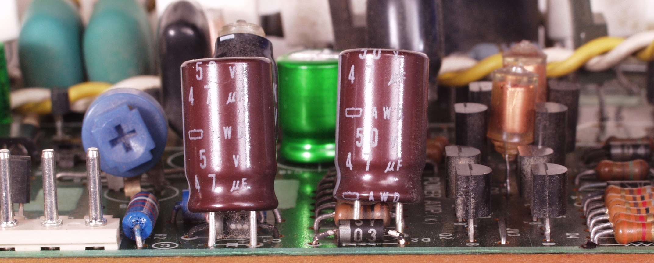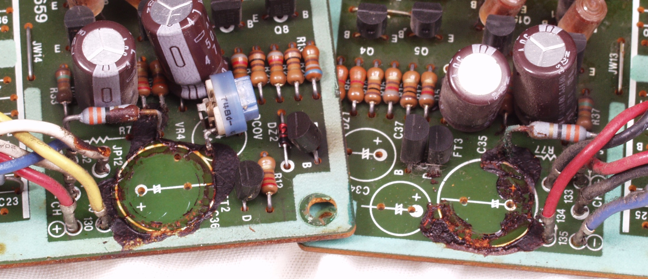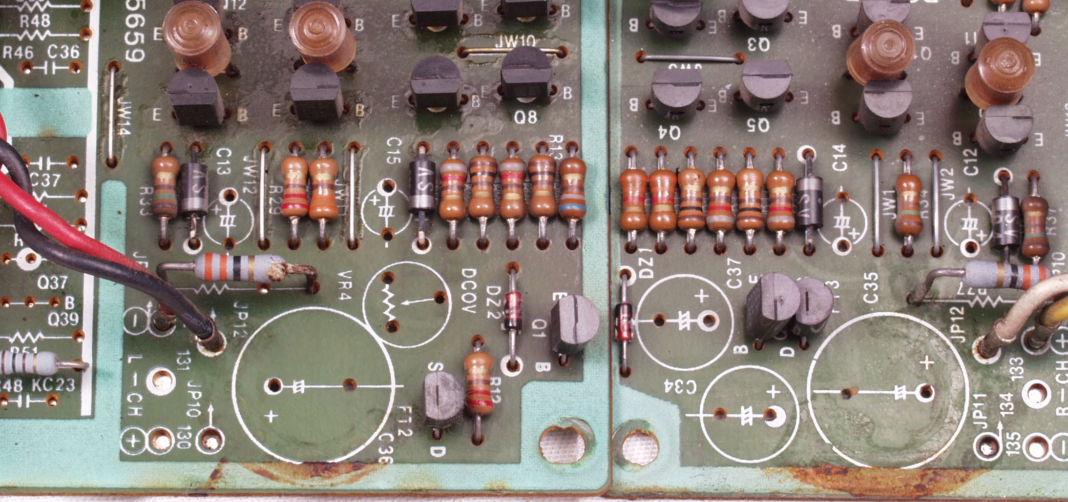 | CE31. 修理前 R・L側終段基板 電解コンデンサーのブレ止めに使用した接着剤が抵抗やTR(トランジスター)の端子を腐食させている | ||||||||||||||||||||||||||||||||||||||||||||||||||