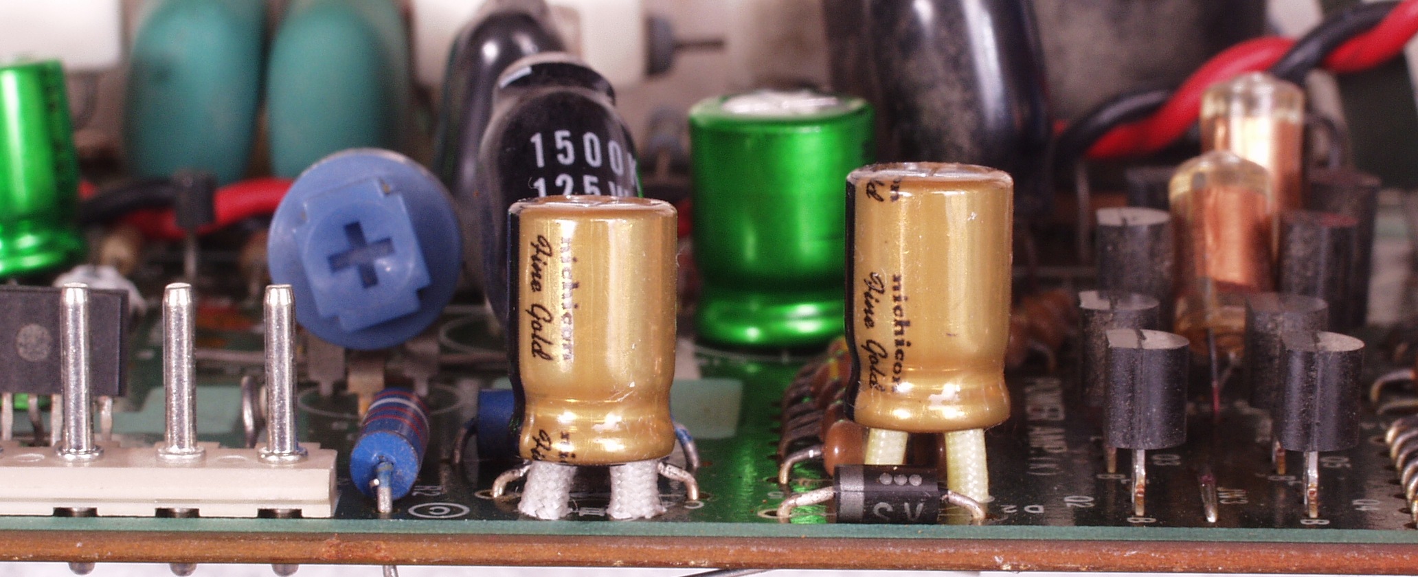 | AD. 点検中 電解コンデンサーを全部(A1.の上の6個の大容量は除く)オーディオ用に交換 下記のミューズ及びゴールドを62個使用(大きさ、容量異なる) |