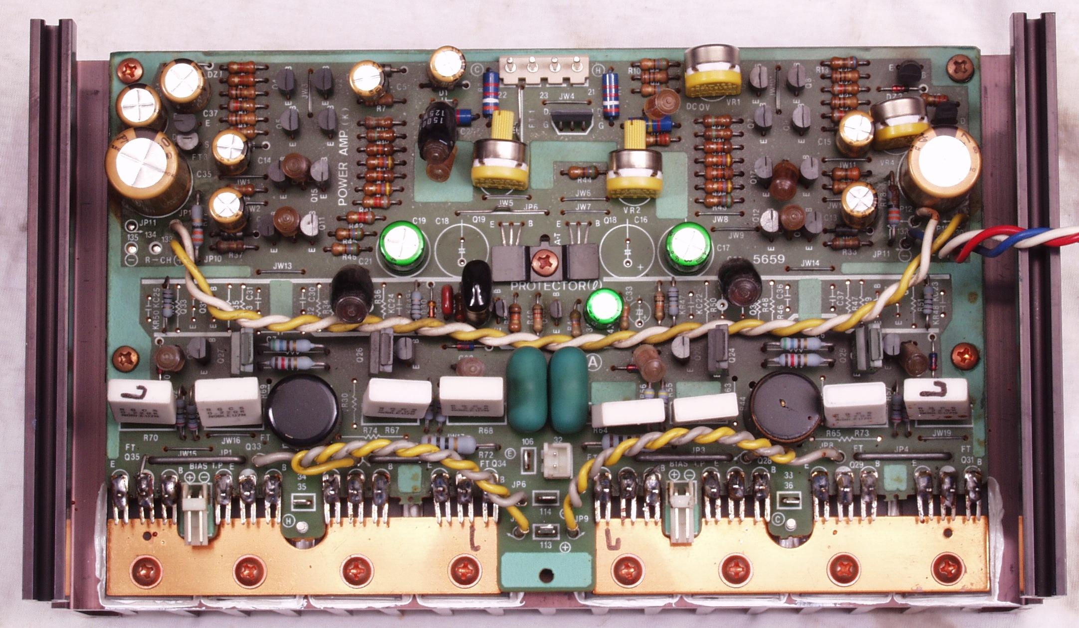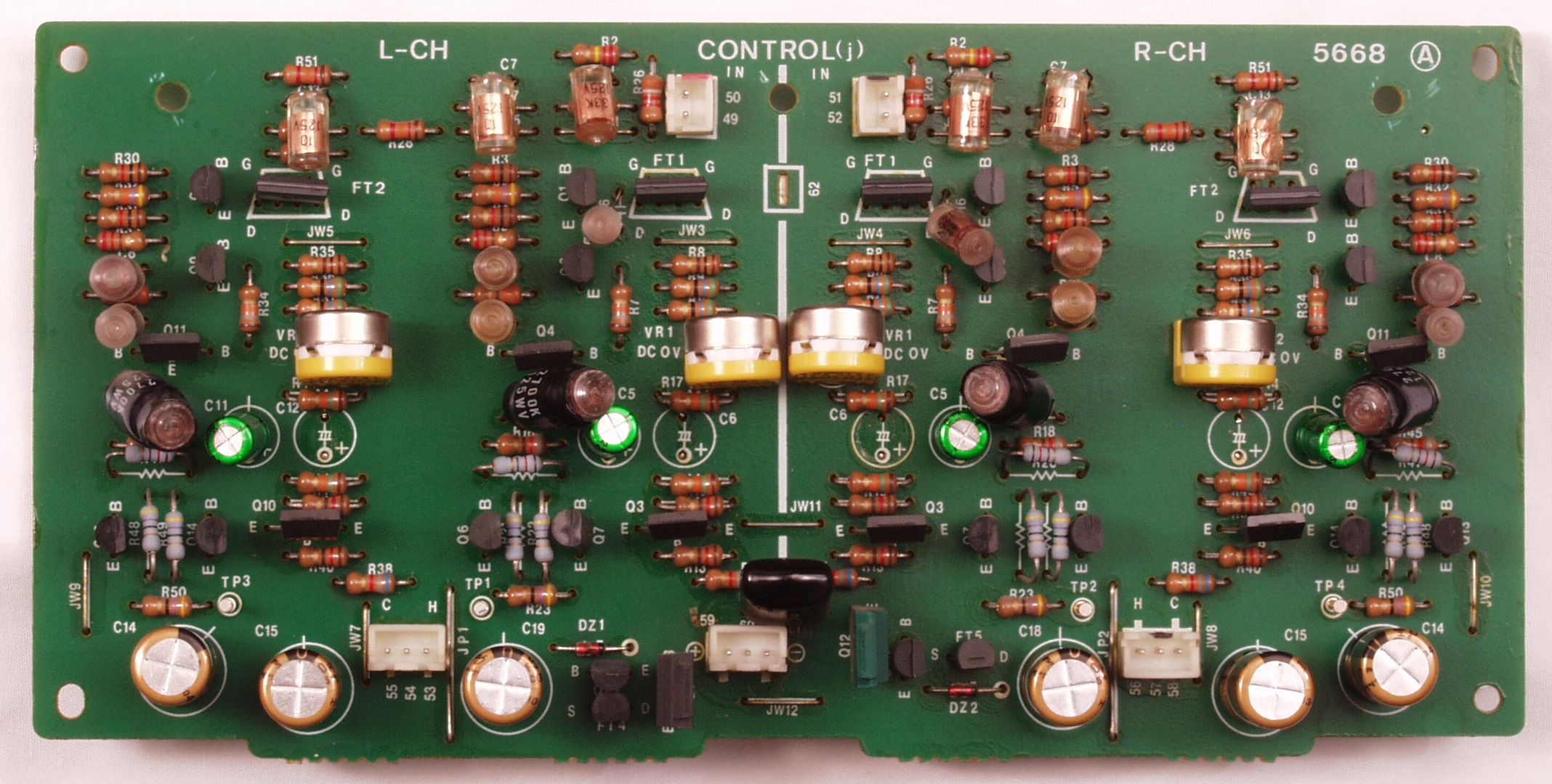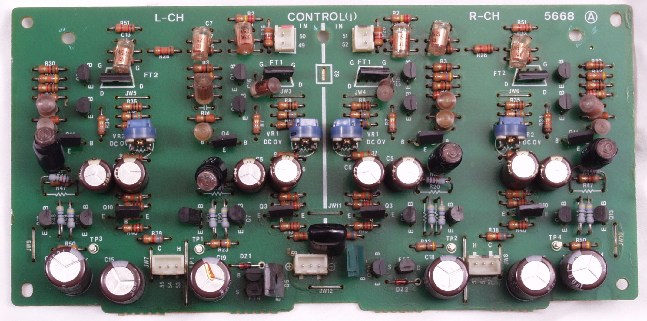 | CF4. 修理後 L側終段基板 半固定VR4個、初段FET(電界効果トランジスター)、電解コンデンサ−16個交換 | ||||||||||||||||||||||||||||||||||||||||||||||||||