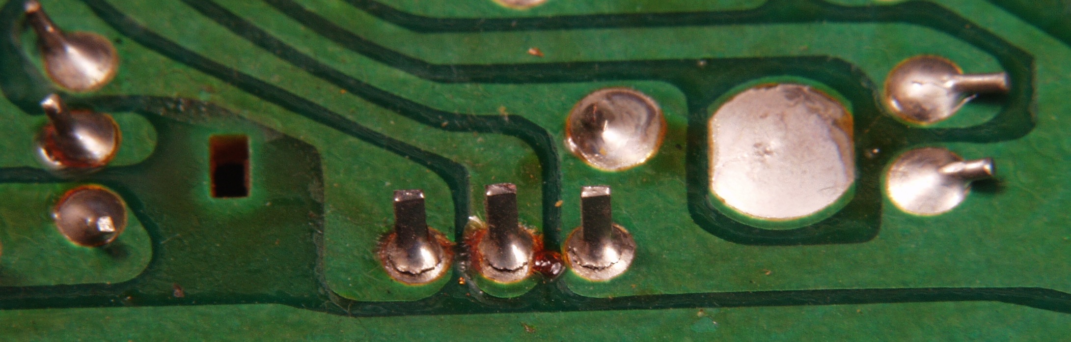 | CE53. 修理後 R側終段基板裏 半田面積を広げる 上記の半田不良の原因は中型TR(トランジスター)なのに足の半田面積が少なすぎる為、下の様に広げる |