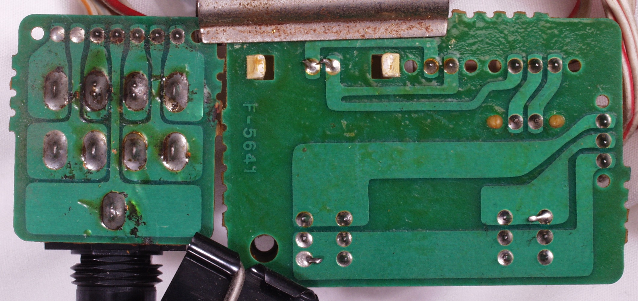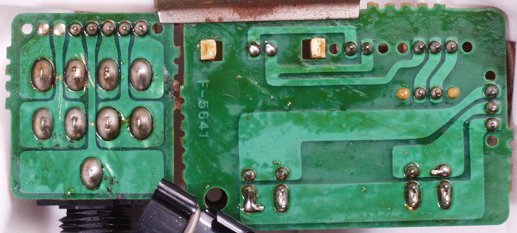 | C92. 修理(ハンダ補正)後 REC−OUT切り替えSW基板裏 全ての半田をやり修す 左下の白い針金みたいの物は糸屑 |