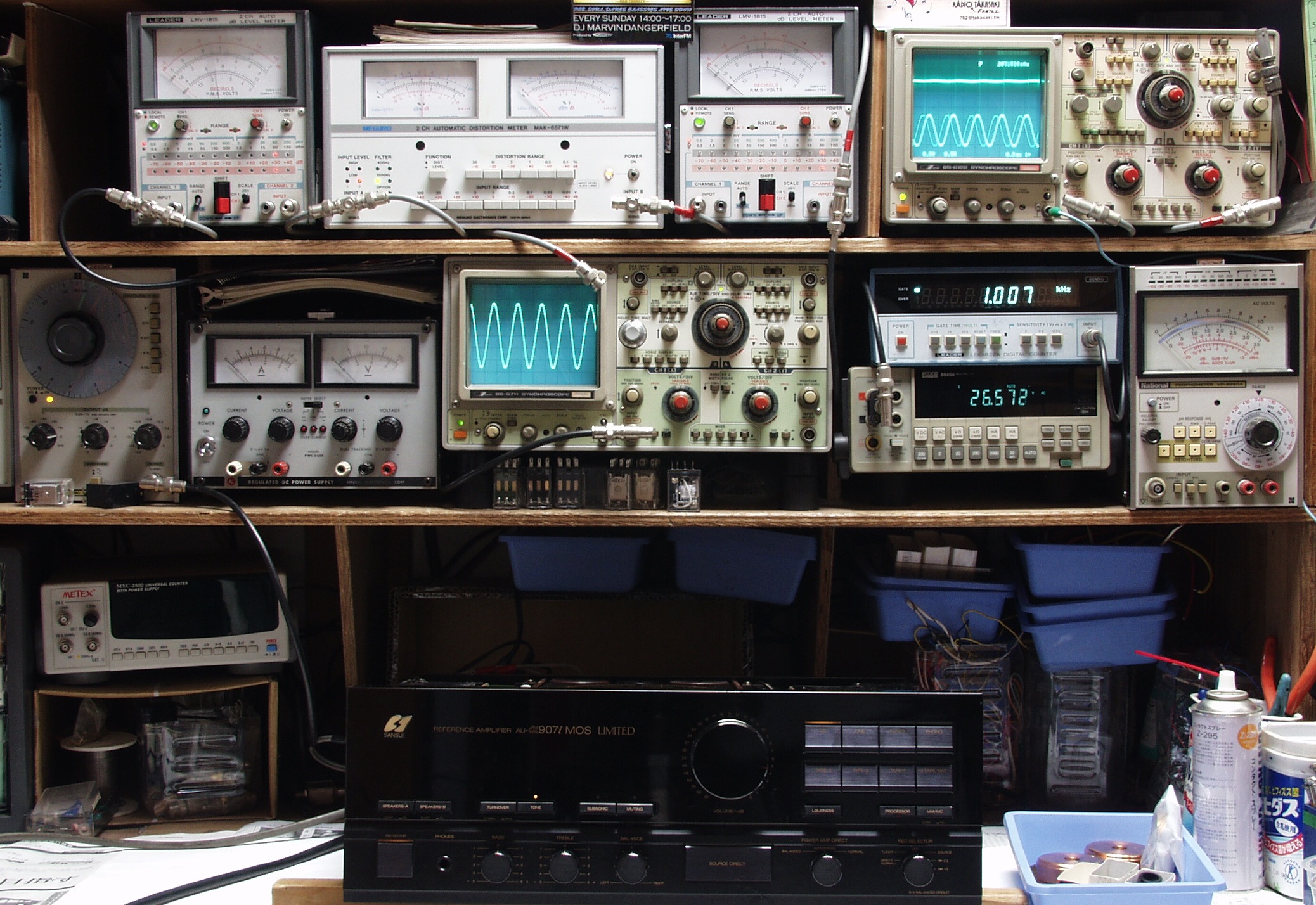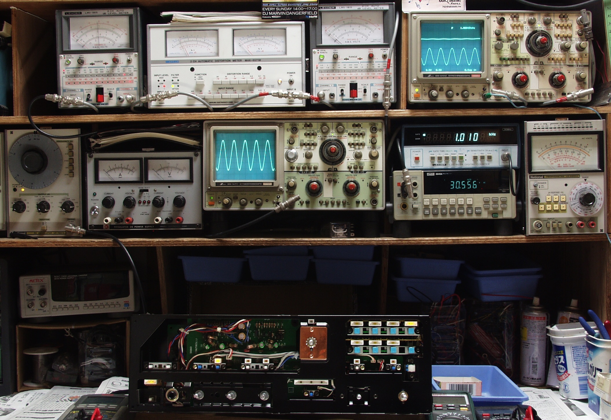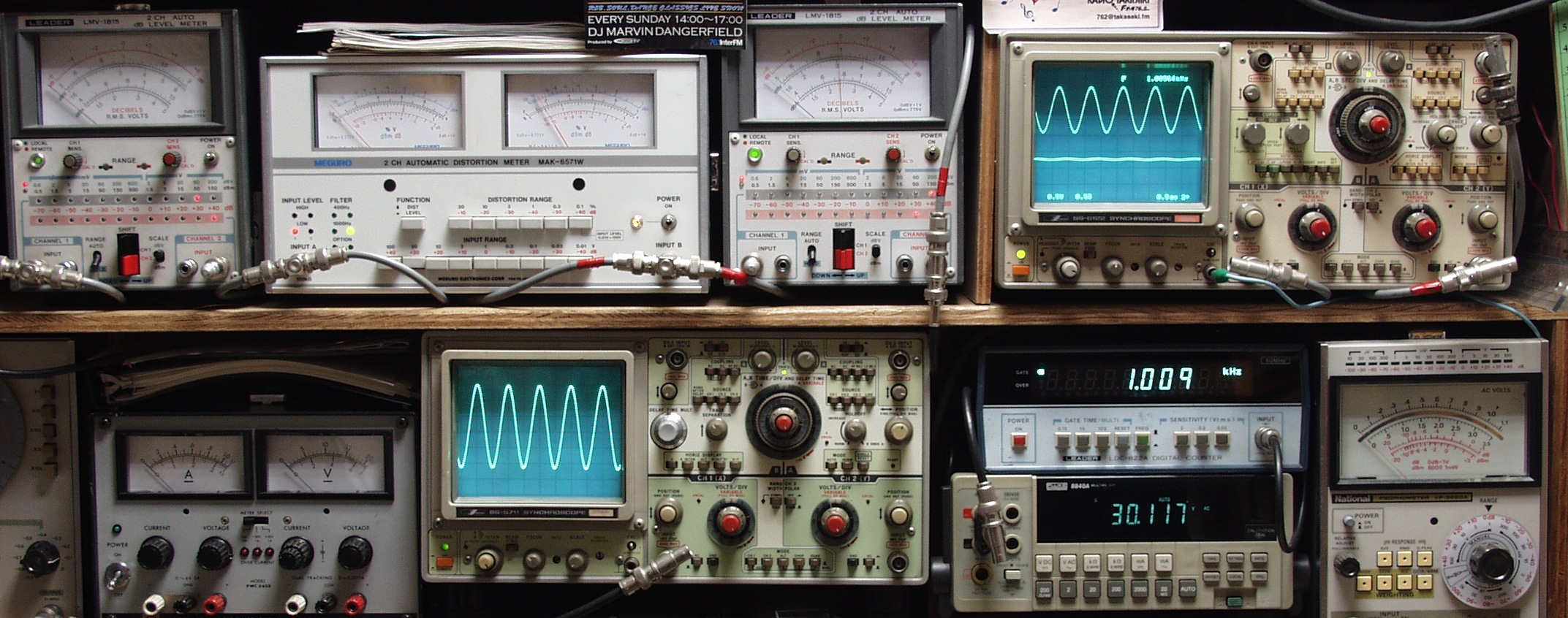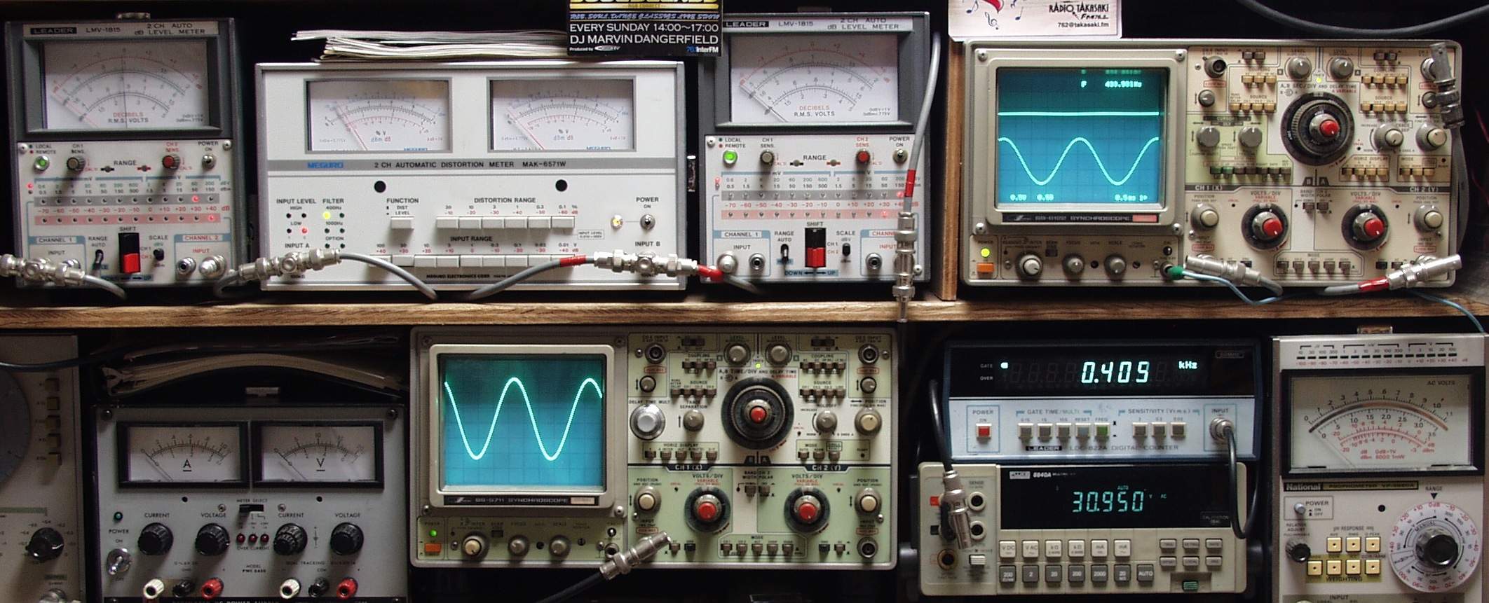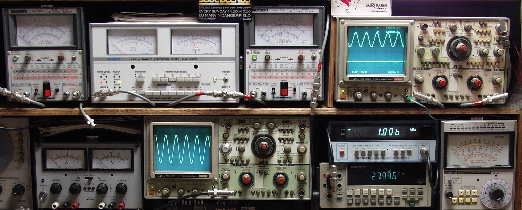 | T. 仮修理での測定。 画像をクリックすると、大きく(横幅2050ドット)表示されます。 T0. 出力・歪み率測定・調整 <見方> 下段左端 オーディオ発振器より400HZ・1KHZの信号を出し(歪み率=約0.003%)これをAMPに入力し、SP出力を測定 下段中左 オシロ=入力波形(オーディオ発振器のTTLレベル) 下段中右上=周波数計 上段左端 電圧計=L側SP出力電圧測定、黒針のみ使用 上段中左 歪み率計=SP出力の歪み率測定 左メータ=L出力、右メータ=R出力 上段中右 電圧計=R側SP出力電圧測定、赤針のみ使用 上段右端 オシロ=SP出力波形 上=R出力、下=L出力(実際にはRL電圧計の出力「Max1V」を観測) 下段中右上 デジタル電圧計=SP出力電圧測定RLは切り替えて測定 |