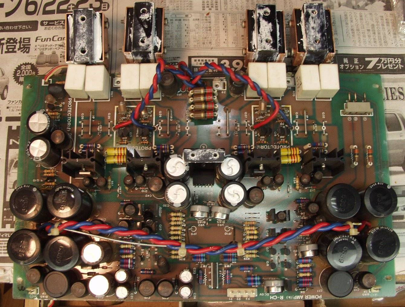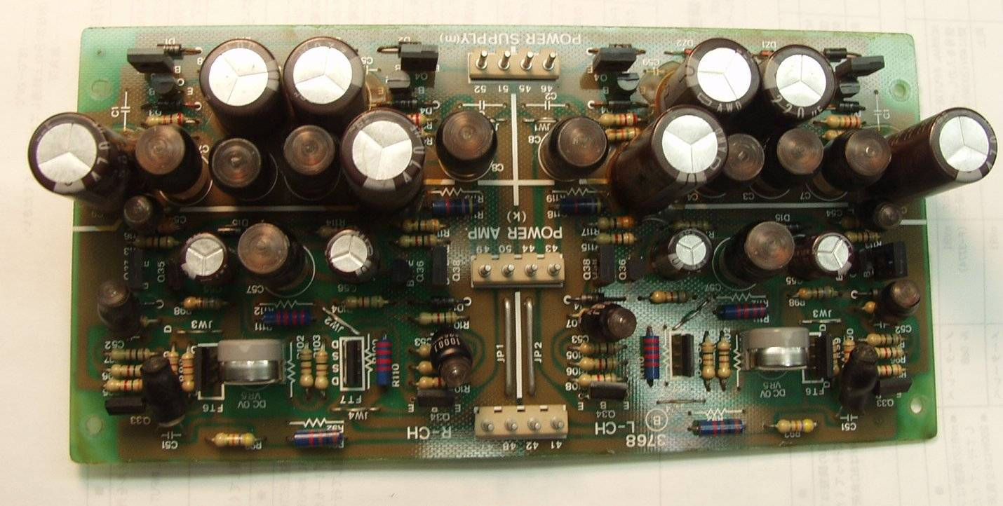 | A3. 修理前 真ん中の4本の電解コンデンサーが不良 終段TR(トランジスター)のショートで、急激な放電で、大電流が流れ、内部がで破壊された 通電すると、約30分くらいで、50度くらいに熱を持つ、これでは、その内、短絡する 4本の内、右側が2本が並列接続で「+電圧」、左側が2本が並列接続で「−電圧」用 壊れたのは、下側の2本、上側2本は熱を持たないが、交換したほうが無難 並列接続で壊れる側は、性能が良い場合が多いい為(下2本は20000μ)です |