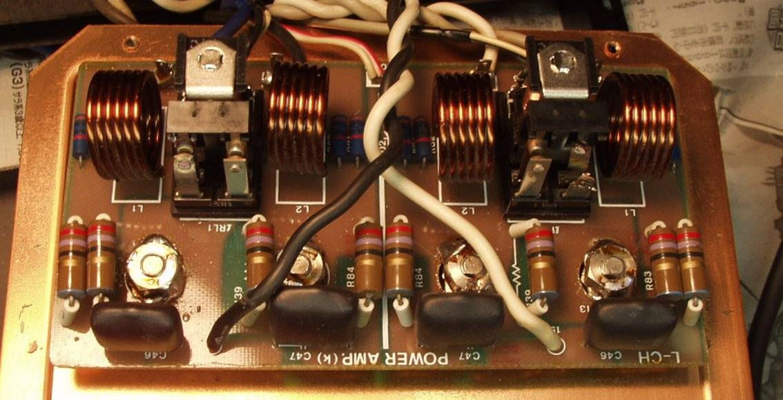 | C6. 修理後 終段基盤、半固定VR、初段FET(電界効果トランジスター)、終段TR(トランジスター)交換 上の4個の塊が、終段TR(トランジスター)が2個付いている物 |