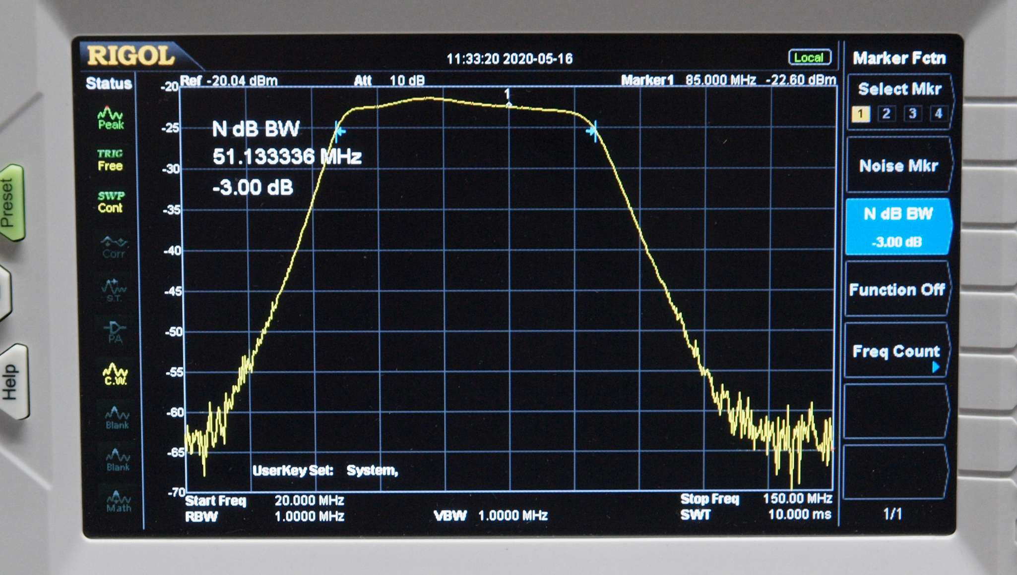 6. 拡大。 Marker1=85MHz、−3dBバンド幅=51.13MHz、横幅は13MHZ。