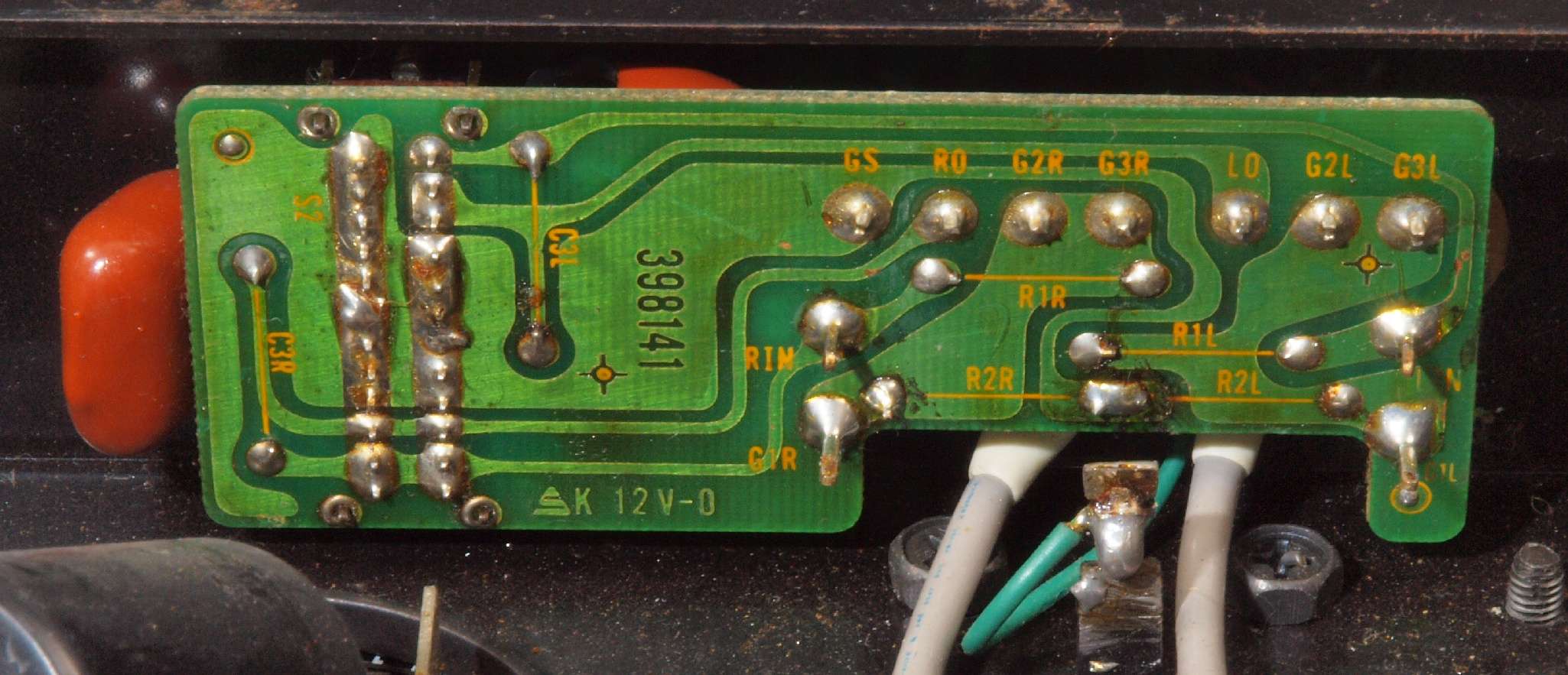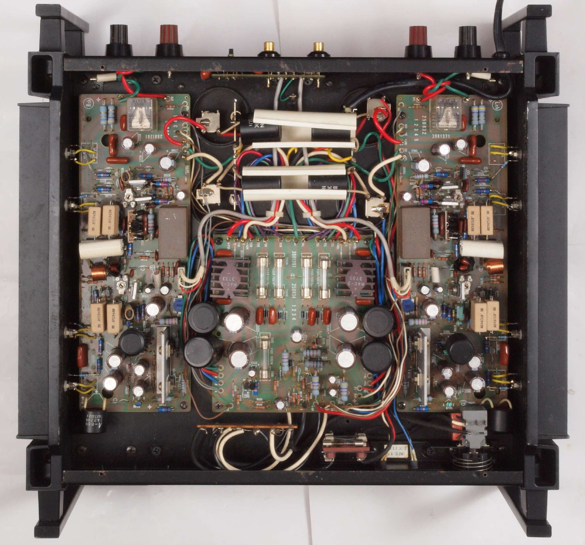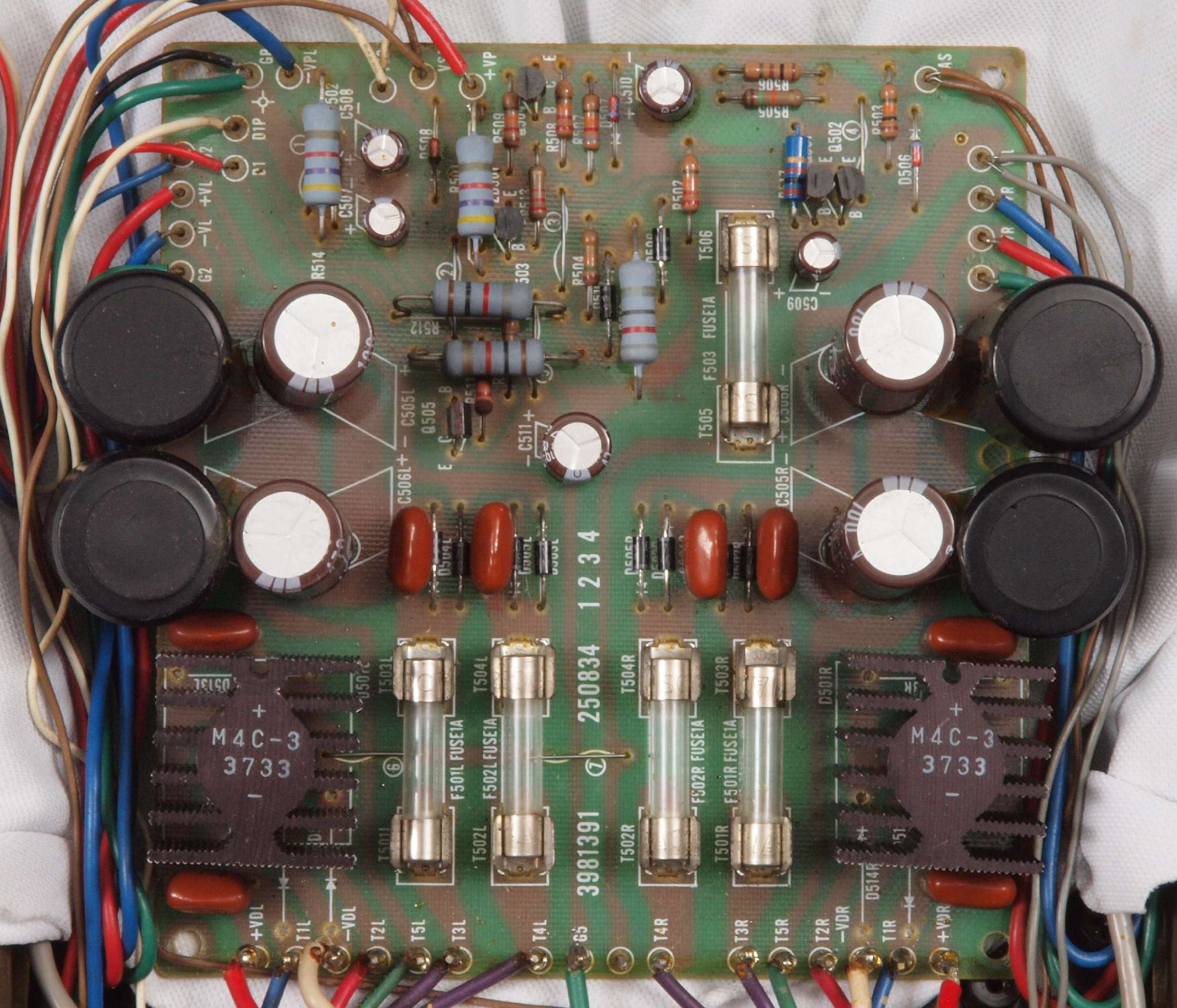 このアンプの特長である高域補正のコンデンサー(片側4個)が取り除かれている。