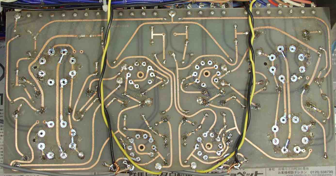 | C1E. 修理中 AMP基板 裏 ソケットを取り除いた所 |