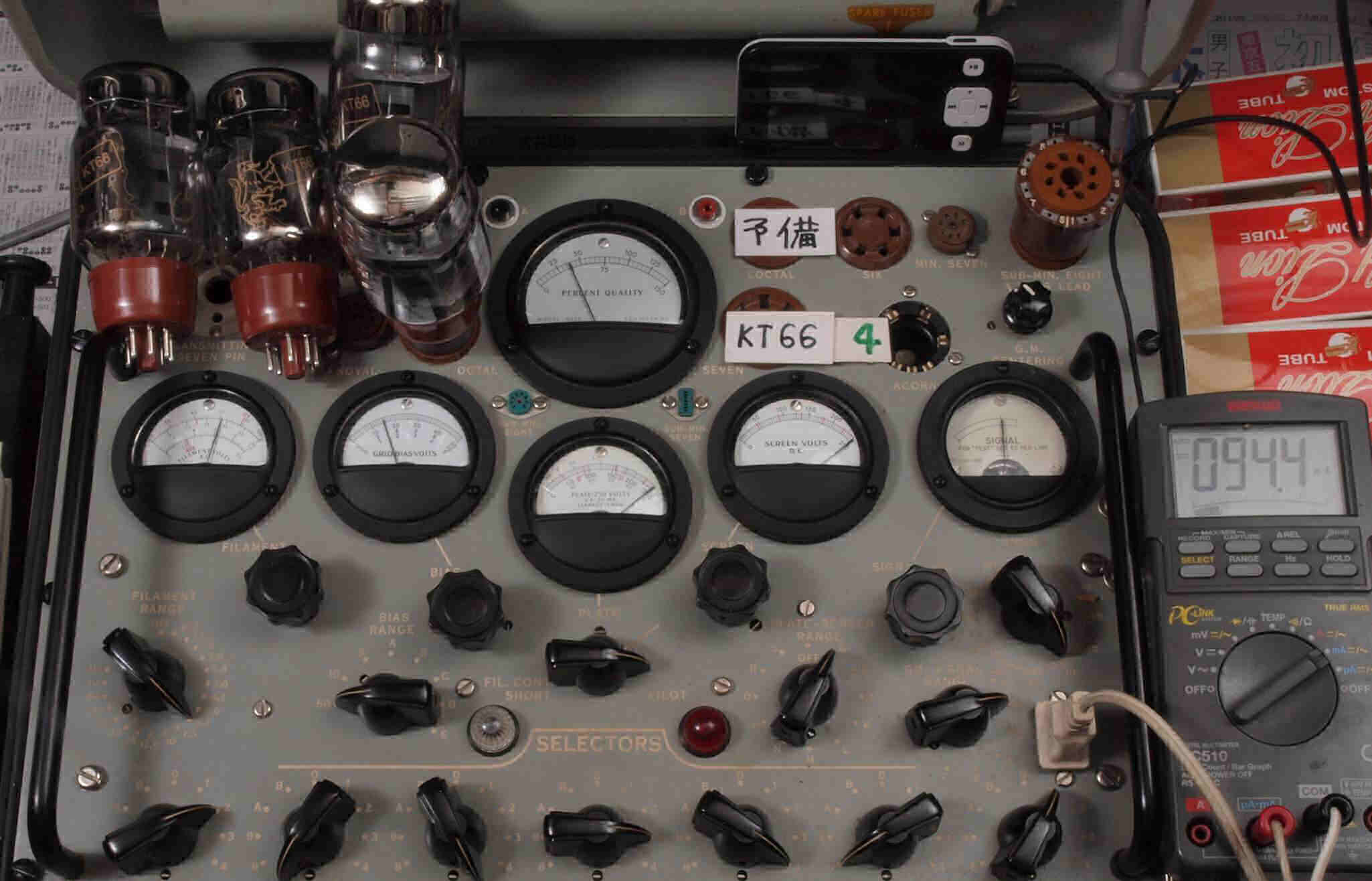 K1. 1本目「KT66」。 Gm測定=4000μmho、IP=92.0mA。