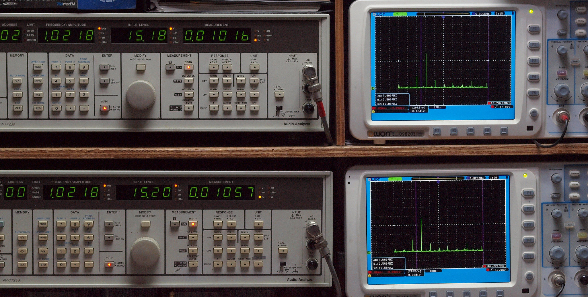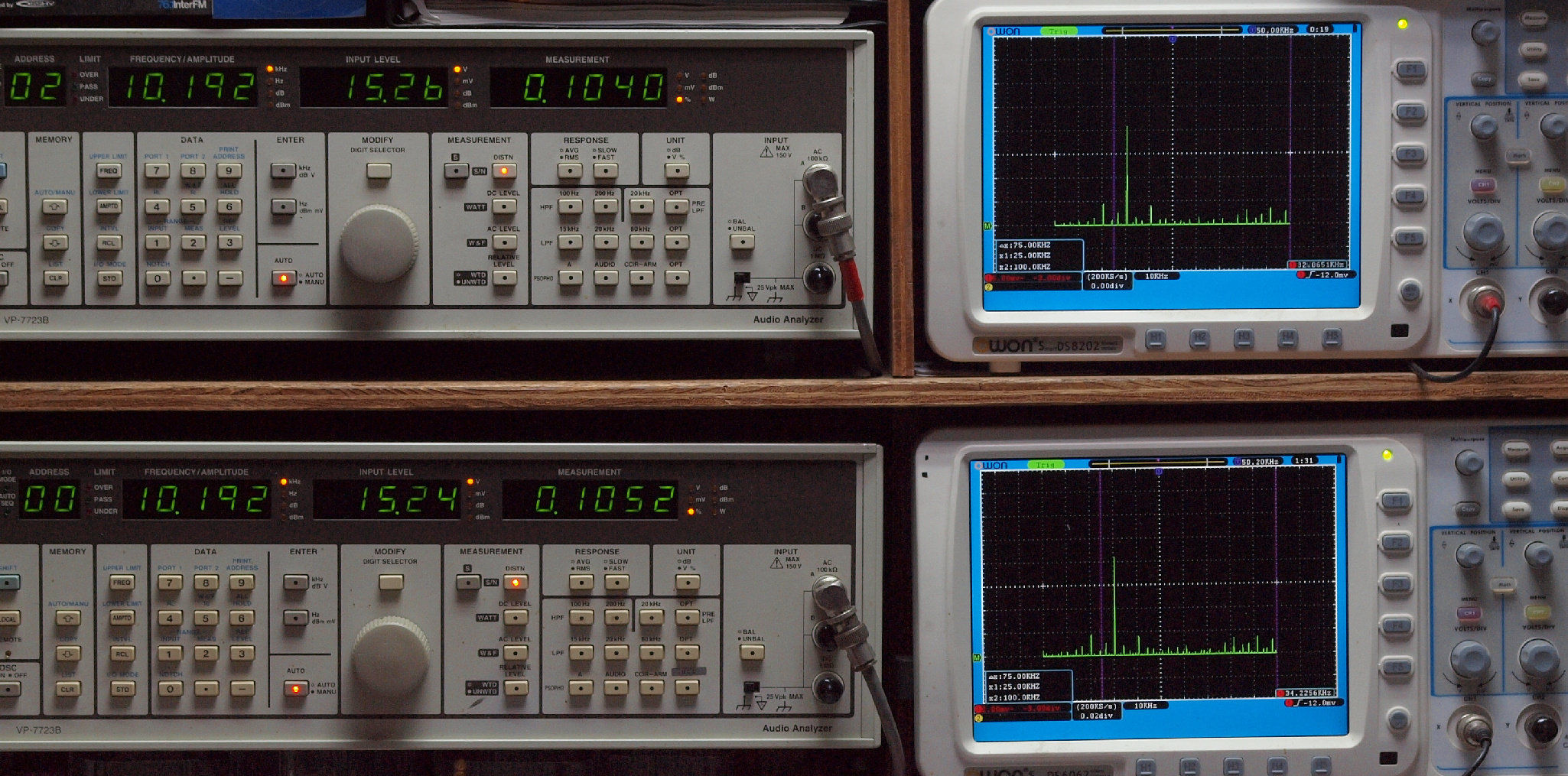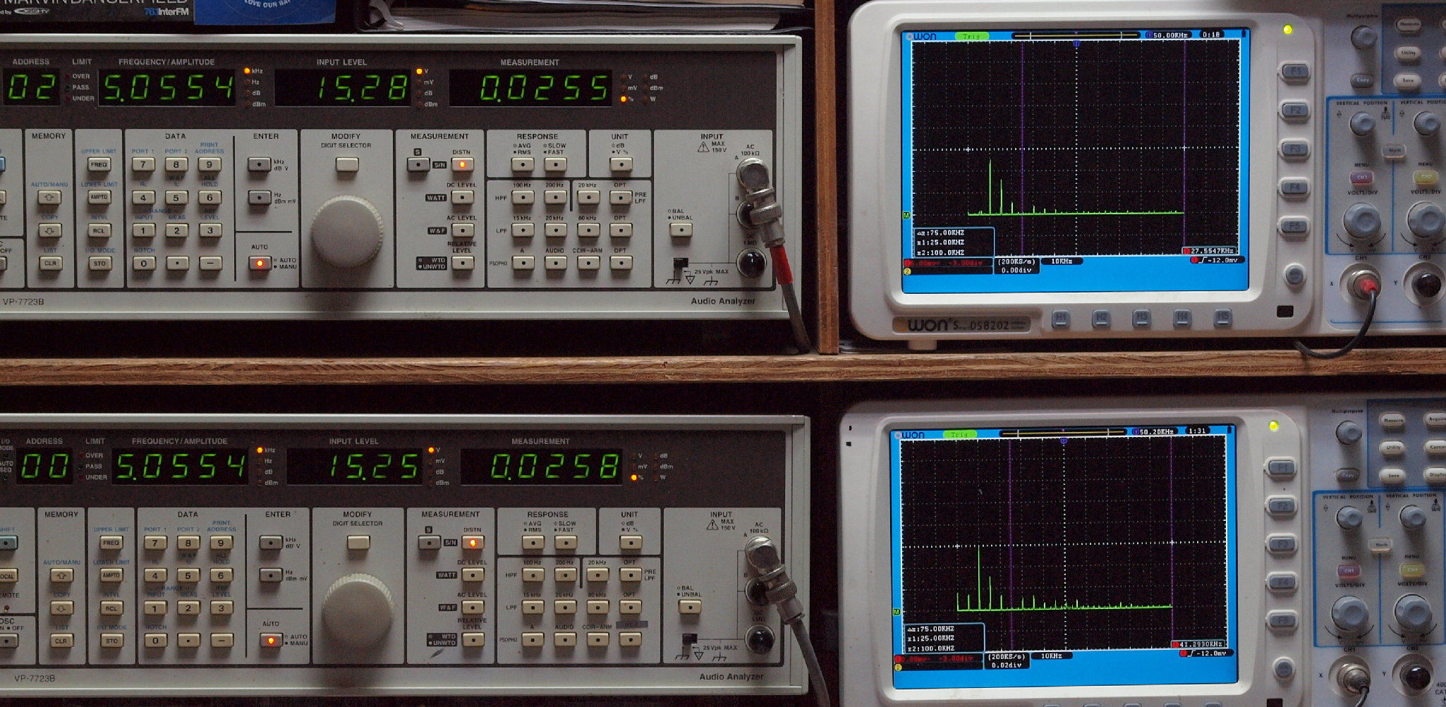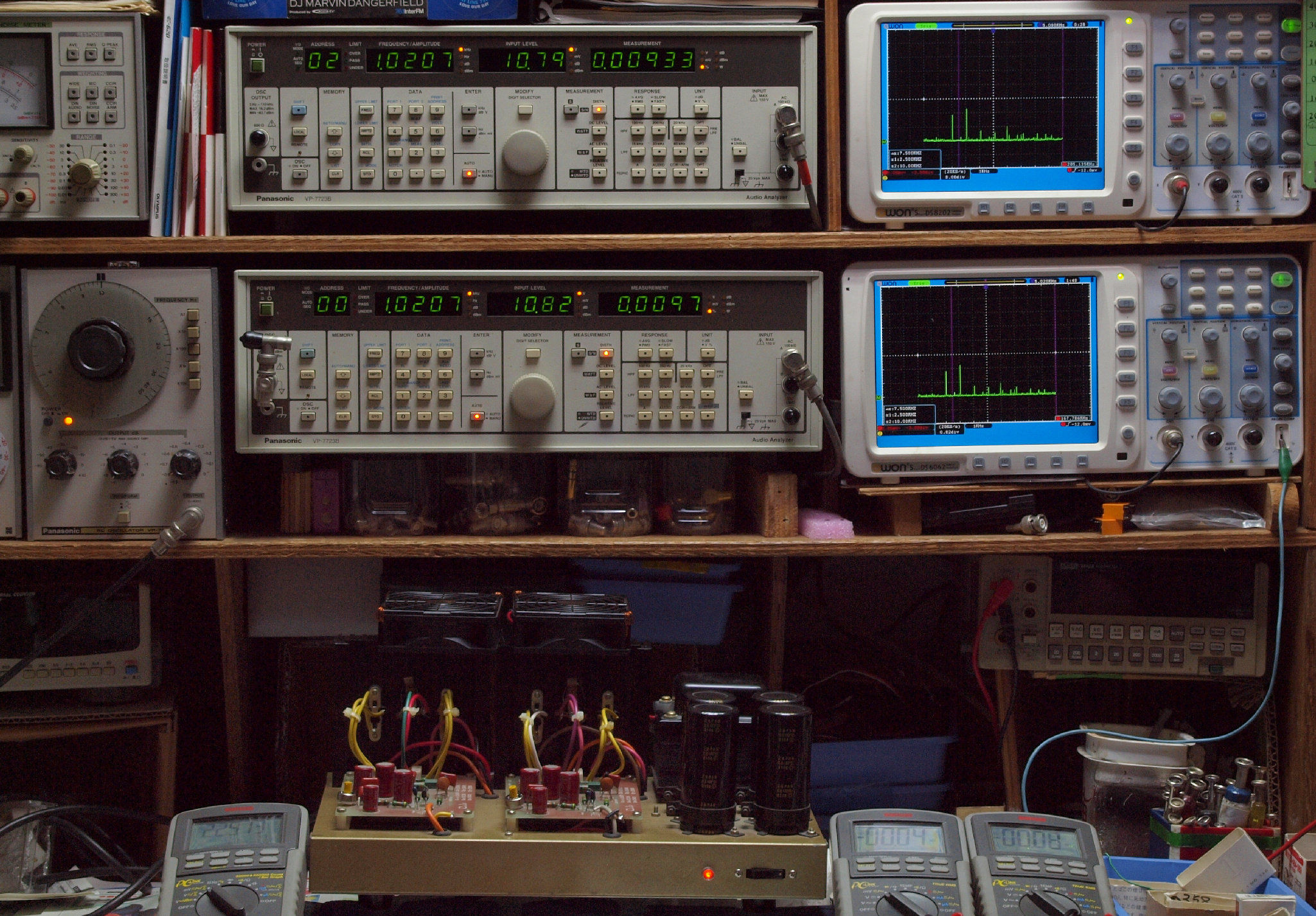 | E. 調整・測定。 画像をクリックすると、大きく(横幅2050ドット)表示されます。 E1. 出力・歪み率測定・調整。 「見方」。 上段中 右側SP出力を「Audio Analyzer Panasonic VP−7723B」により測定。 表示LED、 左端=メモリーNo、 中左=周波数測定、 中右=出力電圧測定、 右端=歪み率測定。 上段右端 VP−7723Bの基本波除去出力を「owon SDS8202(200MHZ)」で「FFT分析」表示。 下段中 左側SP出力を「Audio Analyzer Panasonic VP−7723B」により測定。 表示LED、 左端=メモリーNo、 中左=周波数測定、 中右=出力電圧測定、 右端=歪み率測定。 下段右端 VP−7723Bの基本波除去出力を「owon SDS6062(200MHZ)」で「FFT分析」表示。 下段左端 オーディオ発振器 VP−7201A より50Hz〜100kHzの信号を出し(歪み率=約0.003%)、ATT+分配器を通し、AMPに入力。 よって、ダイアル設定出力レベルより低くなります。測定機器の仕様や整備の様子はこちら、「VP−7723B」「VP−7201A」。 FFT画面の見方はこちら。 |