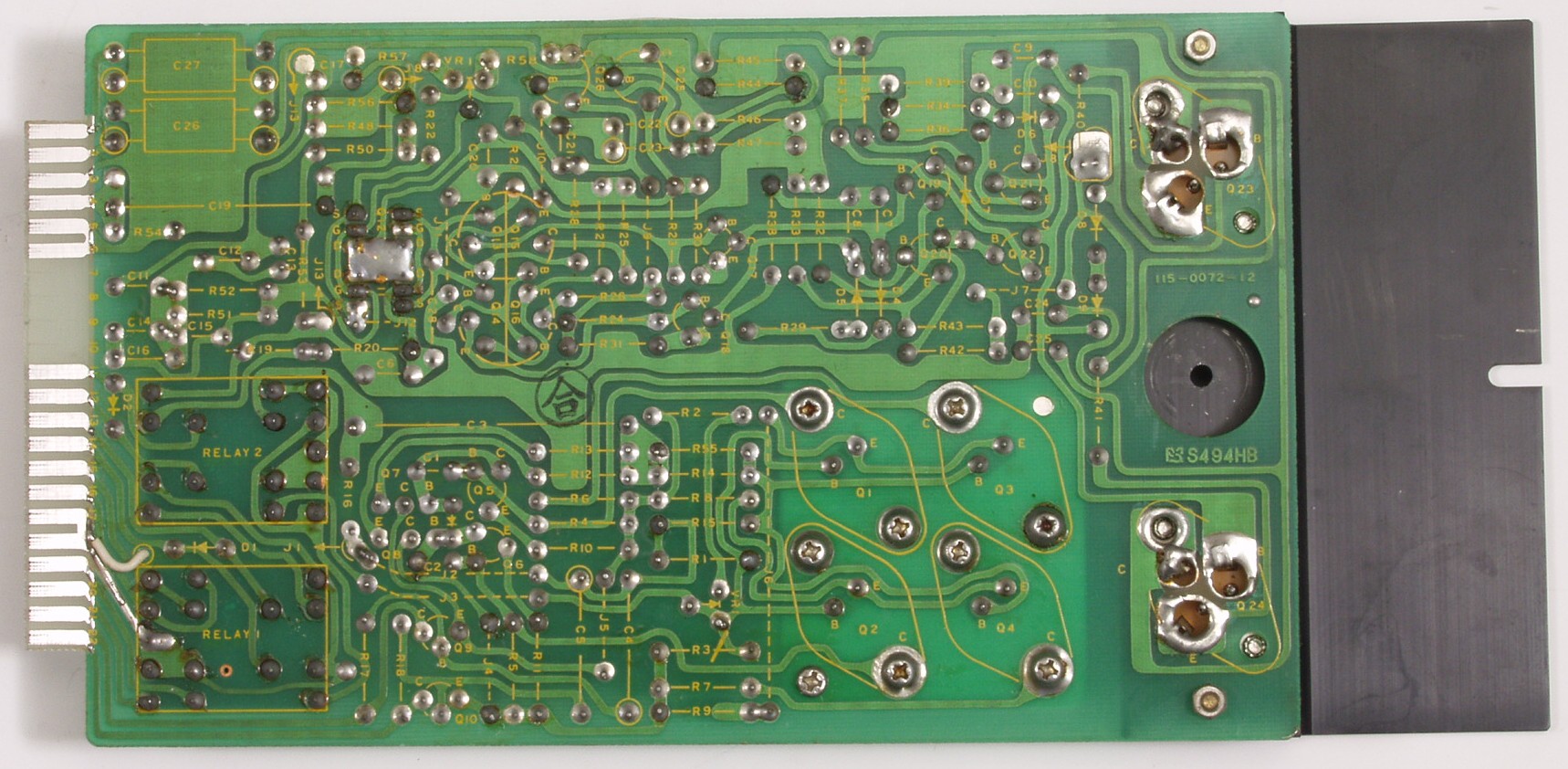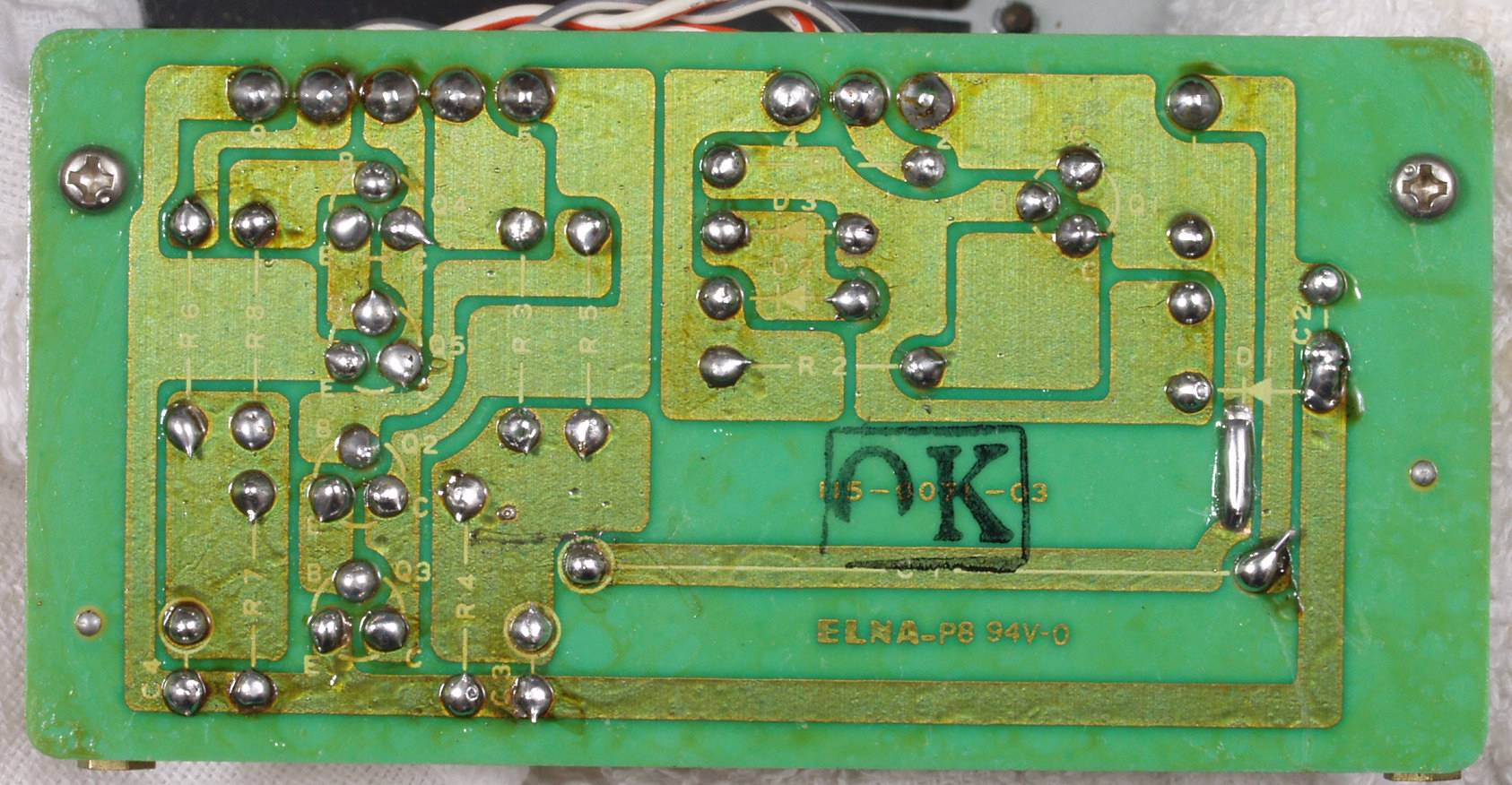 | C3B. 修理後 L側−AMP基板裏 電解コンデンサー4個、半固定VR2個、フイルムコンデンサー2個交換 リレー2個交換 電解コンデンサー2個追加 |