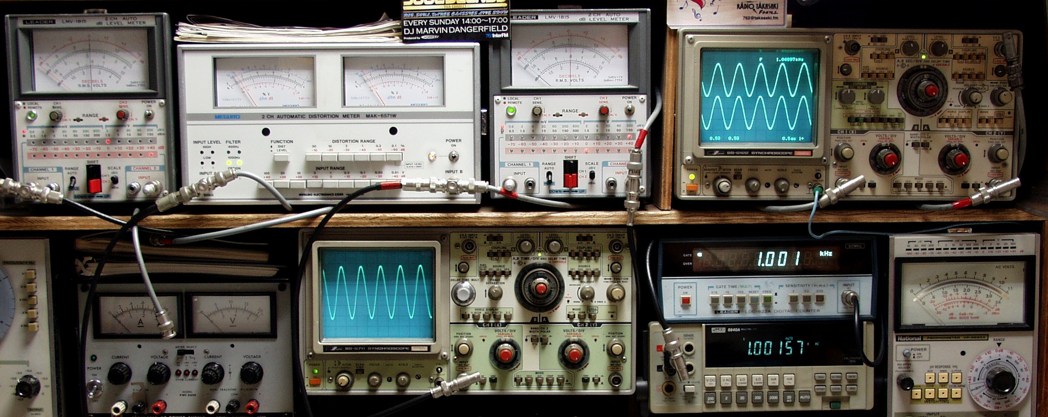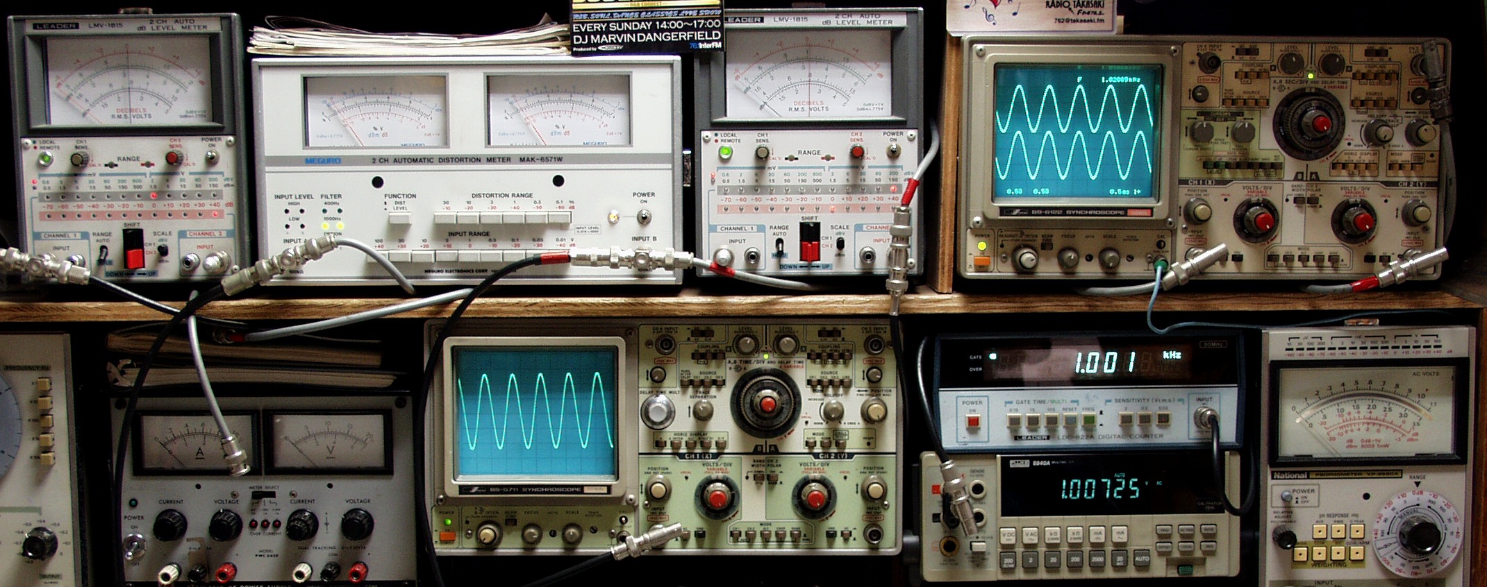 | AA. 修理前・測定 E1. 出力・歪み率測定・調整 <見方> 下段左端 オーディオ発振器より400HZ・1KHZの信号を出し(歪み率=約0.003%)これをAMPに入力し、出力を測定 下段中左 オシロ=入力波形(オーディオ発振器のTTLレベル) 下段中右上=周波数計 上段左端 電圧計=L側出力電圧測定、黒針のみ使用 上段中左 歪み率計=出力の歪み率測定 左メータ=L出力、右メータ=R出力 上段中右 電圧計=R側出力電圧測定、赤針のみ使用 上段右端 オシロ=出力波形 上=R出力、下=L出力(実際にはRL電圧計の出力「Max1V」を観測) 下段中右上 デジタル電圧計=出力電圧測定RLは切り替えて測定 |