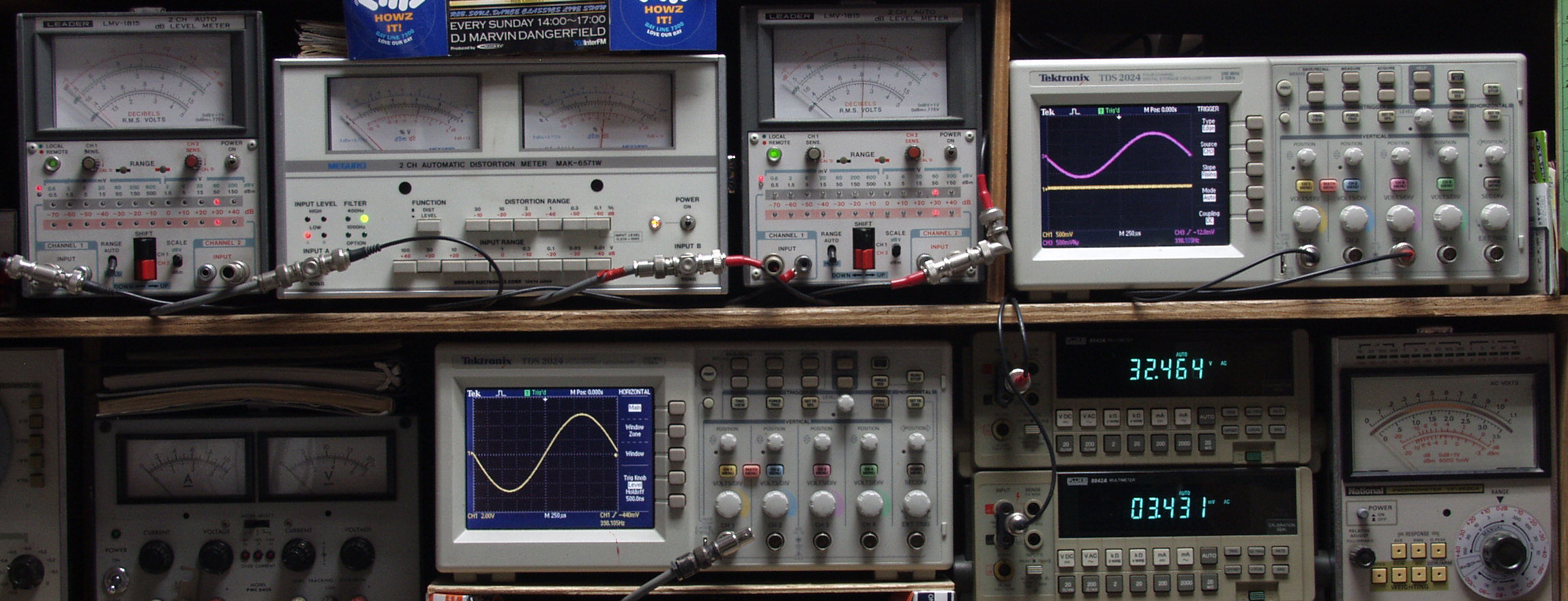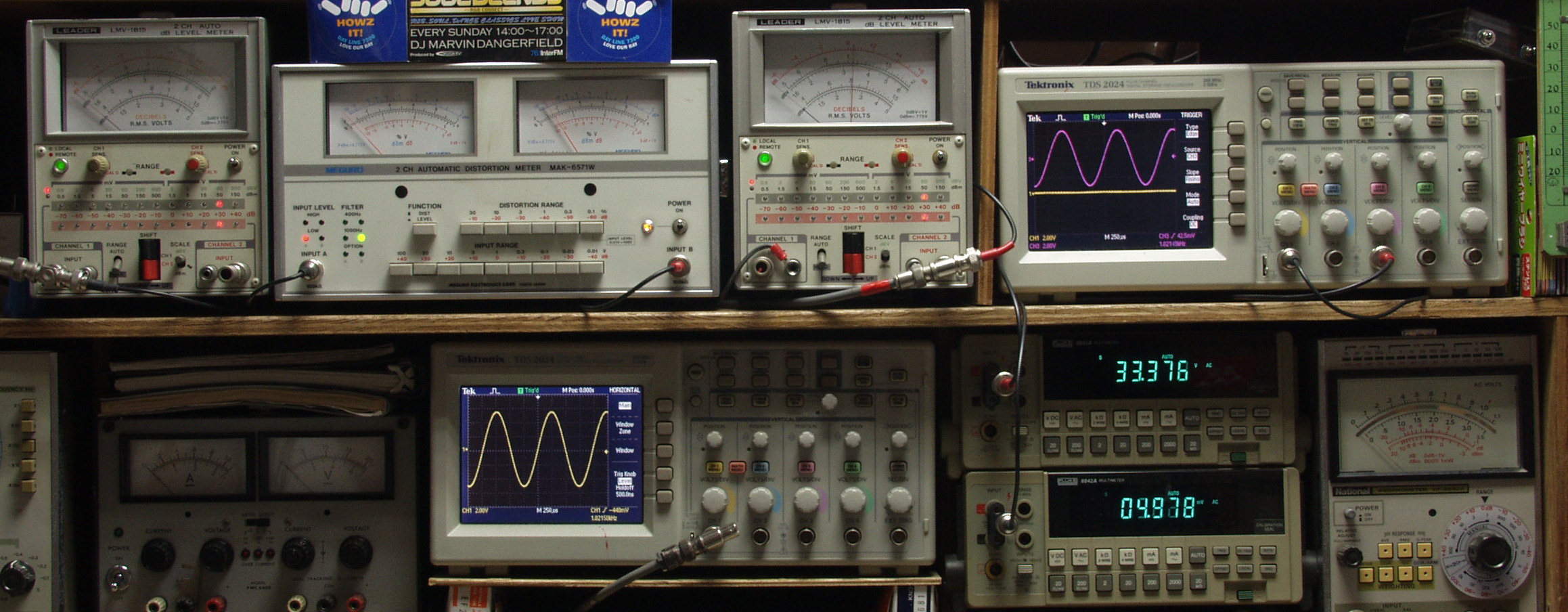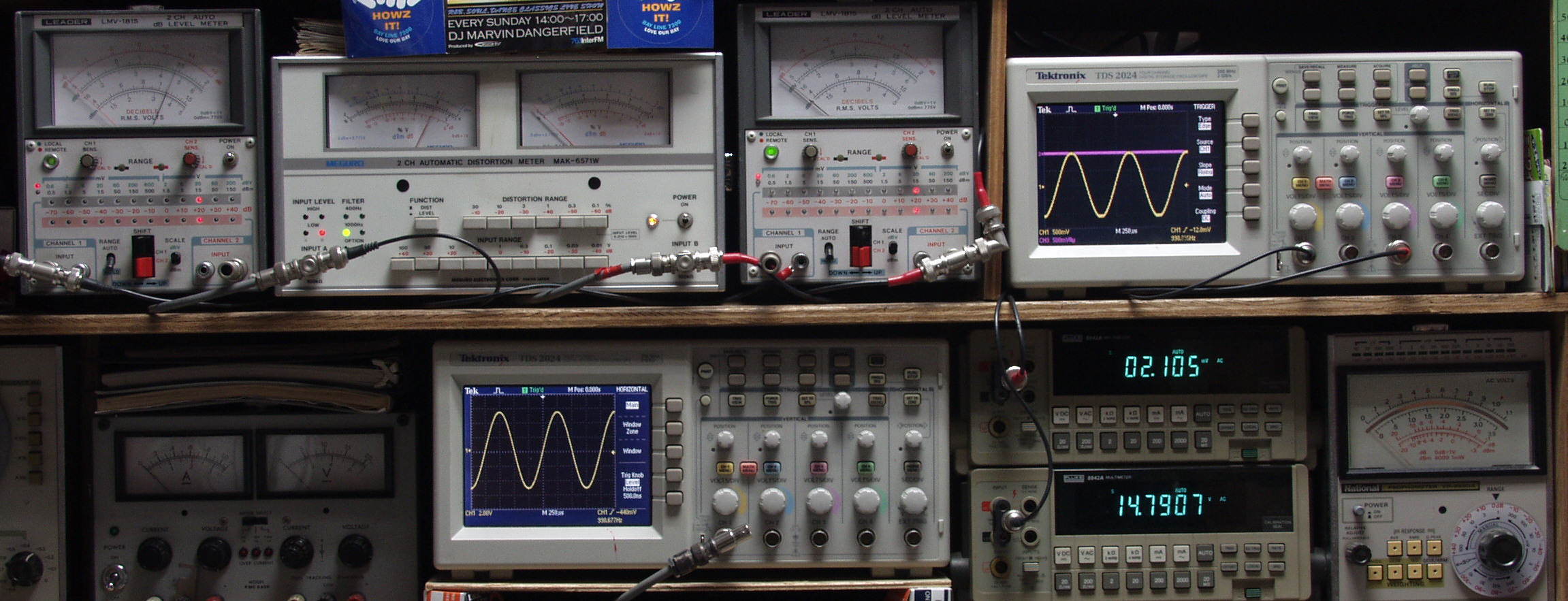| T. 修理前点検測定 T1. 出力・歪み率測定。 「見方」。 下段左端 オーディオ発振器より400HZ・1KHZの信号を出し(歪み率=約0.003%)これをAMPに入力し、出力を測定。 下段中央 オシロ=入力波形(オーディオ発振器のTTLレベル表示)。 上段左端 交流電圧計=L側出力電圧測定、黒針のみ使用。 上段中左 歪み率計=出力の歪み率測定 左メータ=L出力、右メータ=R出力。 上段中右 交流電圧計=R側出力電圧測定、赤針のみ使用。 上段右端 オシロ=出力波形表示、 赤表示=R出力、黄色表示=L出力。(実際にはRL交流電圧計の出力「Max1V」を観測)。 下段中右上 デジタル電圧計=R出力電圧測定。 下段中右下 デジタル電圧計=L出力電圧測定。 |