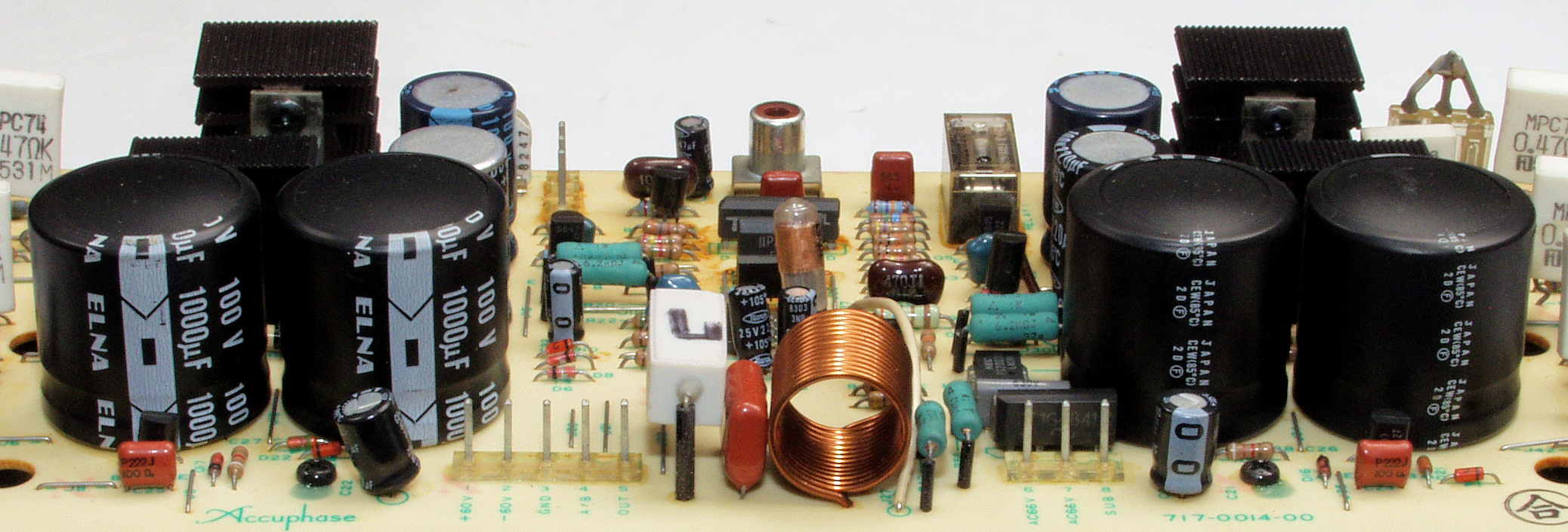 | C211. 修理前 R側−AMP基盤、熱の為、頭の膨らんだ電解コンデンサー4本。 | ||||||||||||||||||||||||||||||||||||||||