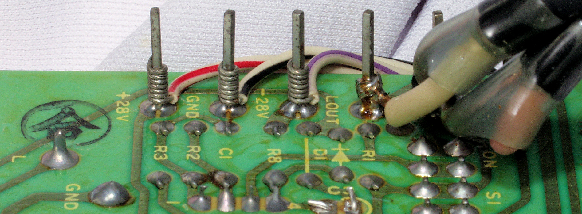 | C241. 修理中 R側−AMP基盤裏、銅箔の半田のりしろを広げる。 | ||||||||||||||||||||||||||||||||||||||||
