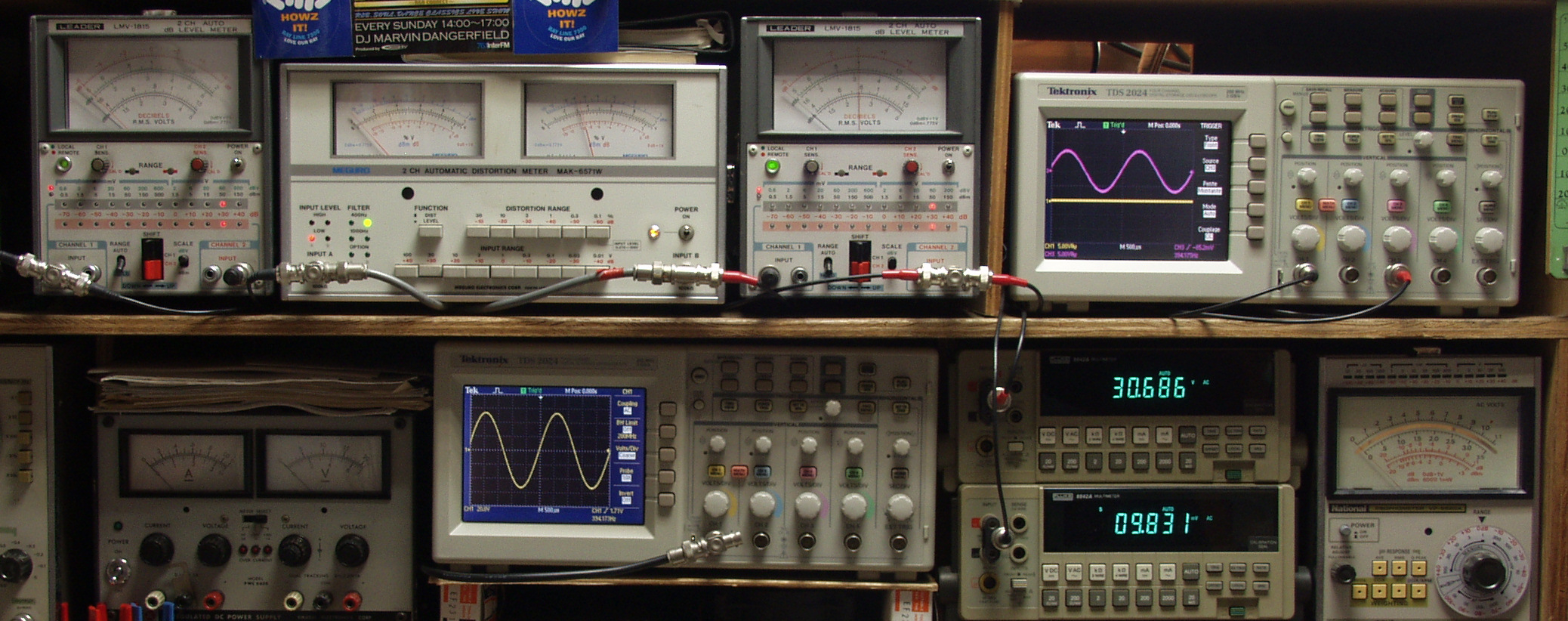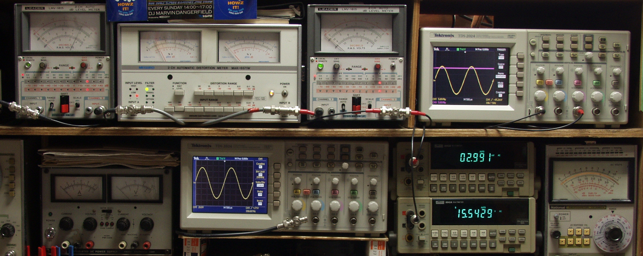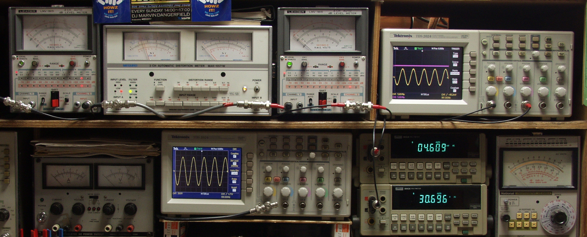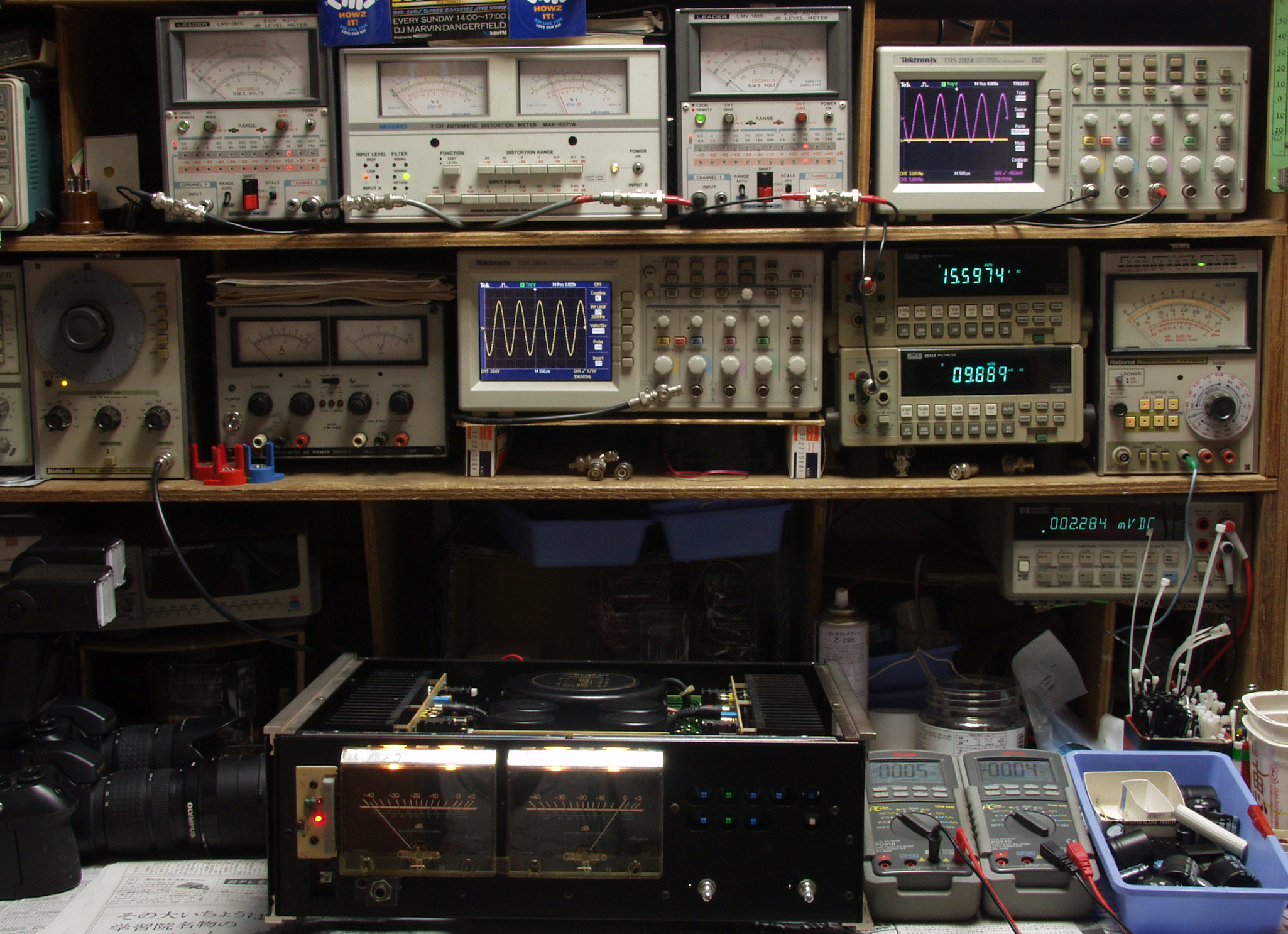 | E. 調整・測定。 画像をクリックすると、大きく(横幅2050ドット)表示されます。 E1. 出力・歪み率測定・調整 「見方」。 下段左端 オーディオ発振器より400HZ・1KHZの信号を出し(歪み率=約0.003%)これをAMPに入力し、出力を測定。 下段中左 オシロ=入力波形(オーディオ発振器のTT=レベル)。 上段左端 電圧計=L側出力電圧測定、黒針のみ使用。 上段中左 歪み率計=出力の歪み率測定。 左メータ=L出力、右メータ=R出力。 上段中右 電圧計=R側出力電圧測定、赤針のみ使用。 上段右端 オシロ=出力波形、上=R出力、下=L出力(実際にはRL電圧計の出力「Max1V」を観測)。 下段中右上 デジタル電圧計=R出力電圧測定。 下段中右下 デジタル電圧計=L出力電圧測定。 |