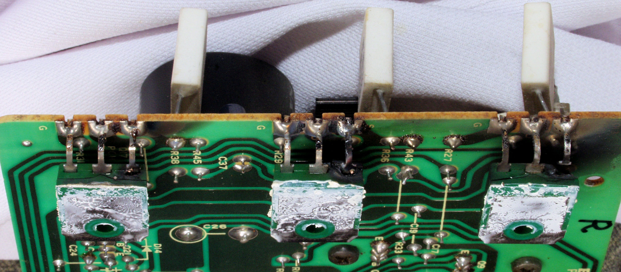 | AA2. 点検中 「Speakers切替SW基板」と「MeterFunction切替SW基板」に残る、焼損したR側終段FET(電界トランジスター)のアーク跡 | ||||||||||||||||||||||||||||||||||||||||