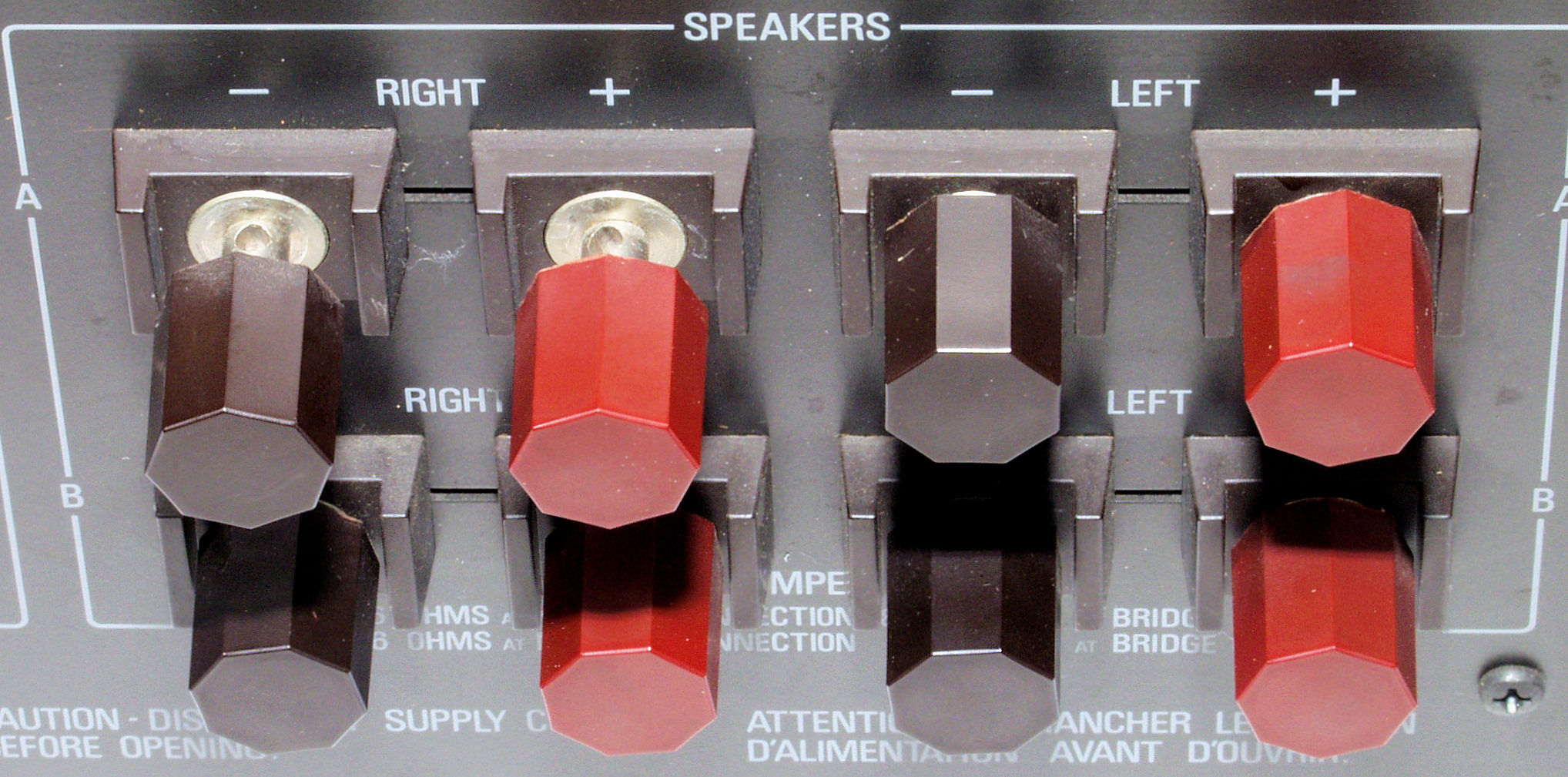 | モードSWの使用上の注意 多分マニアルに表記してあると思いますが、必ず電源SWをOFFにして切り替えます。 A級→B級はOKですが、 B級→A級はNGです。運が悪いと、終段FETが死にます・ 「終段FET」B級動作の供給電圧は60VDC(電源電圧45VAC)。 「終段FET」A級動作の供給電圧は29VDC(電源電圧22VAC)。 これと、終段FETのバイアス電流値を切り替える方式を取っている 所が、大容量電界コンデンサーが接続されているので 供給電圧は、直ぐには低くならない。 結果、終段FETがB級動作の供給電圧=60VDCのまま、A級動作バイアス電流値に切り替わり、焼損する。 勿論、遅延装置が付いてはいますが、故障する事もあります。 このAMPに使用されている終段FET(電解トランジスター)は、現在製造されている物と大きく特性が異なります。 |