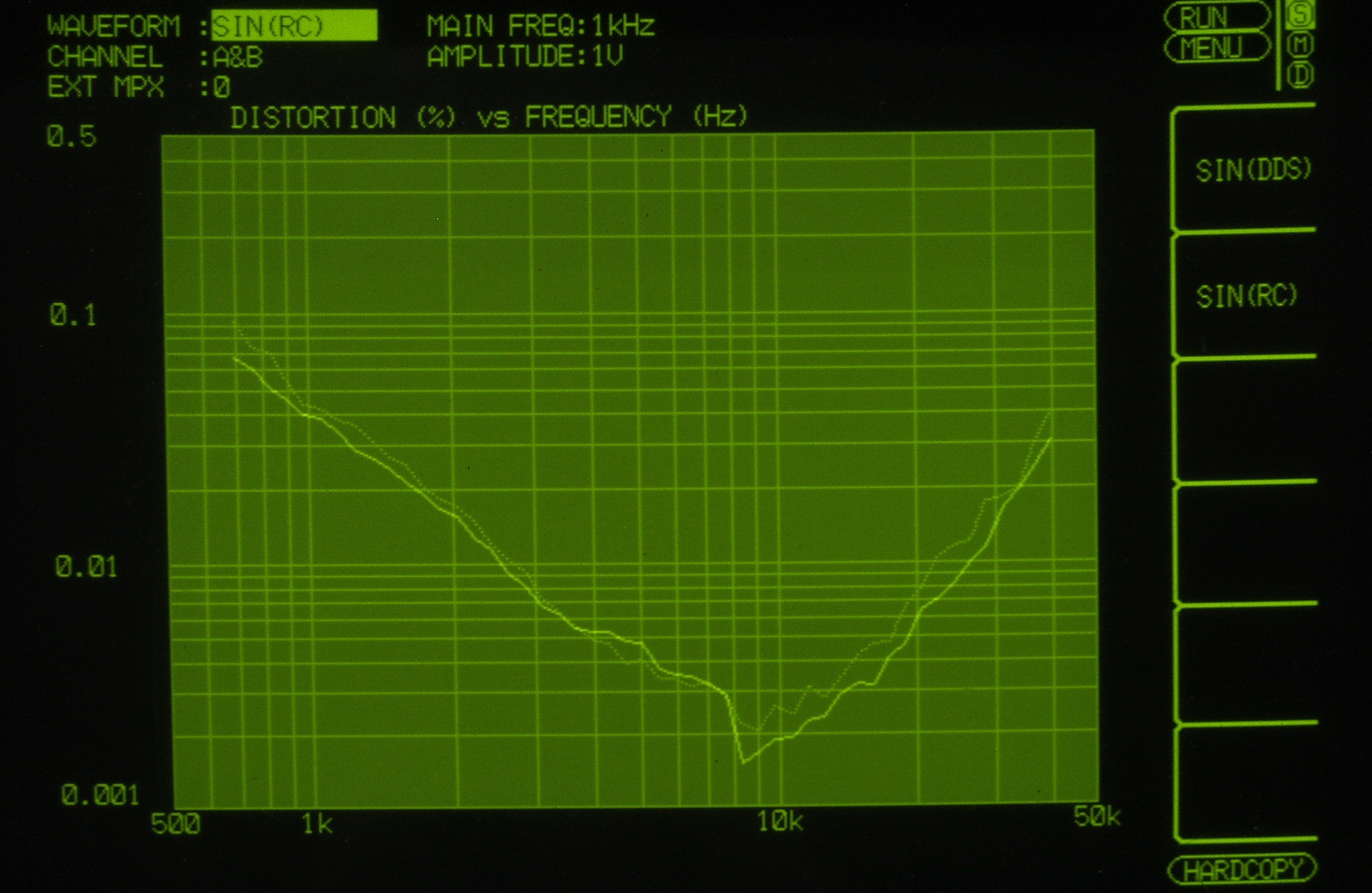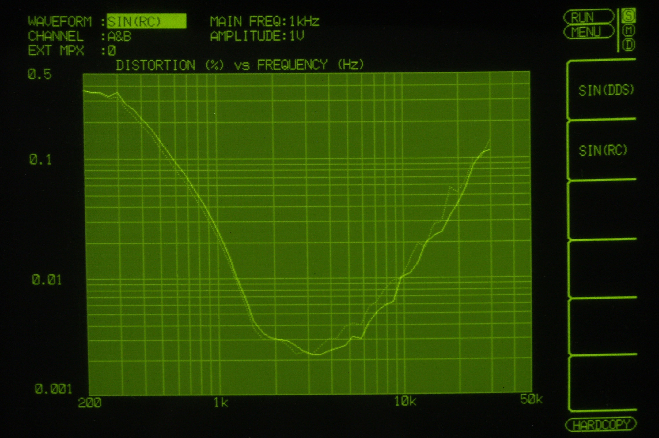 EE31. 歪み測定チャネ1、入力電圧=1V一定入力、VRはmax、左出力=薄(細い)色 右出力=濃い(太い)色