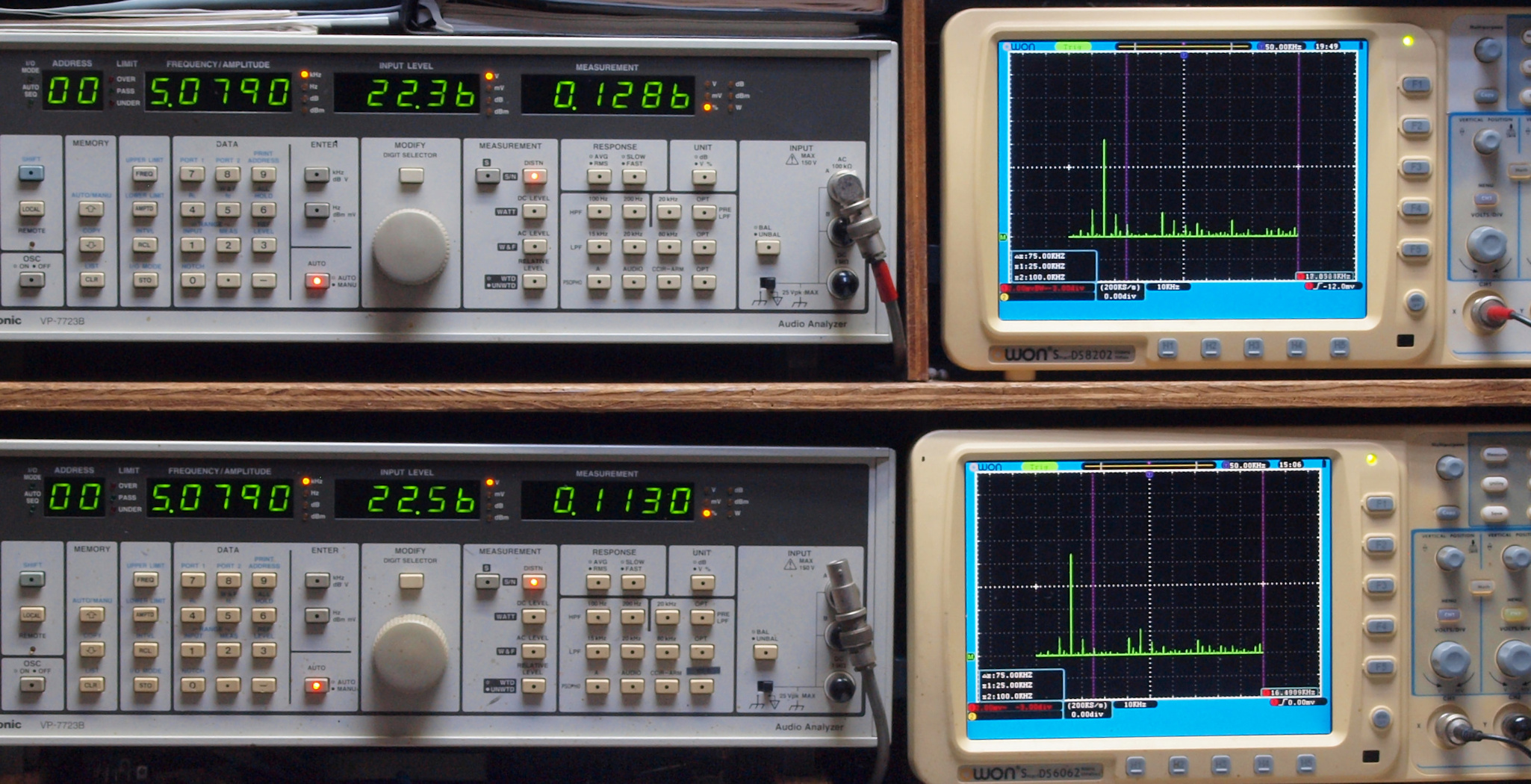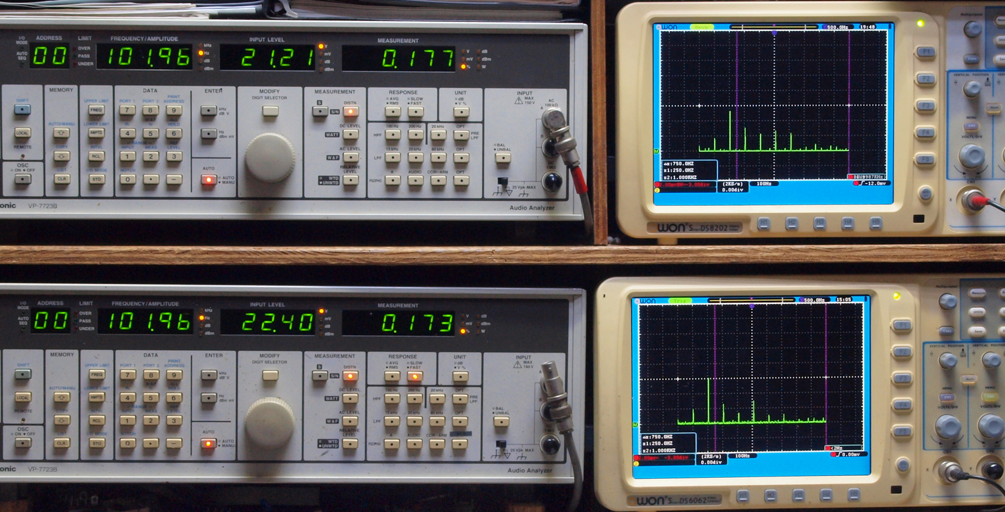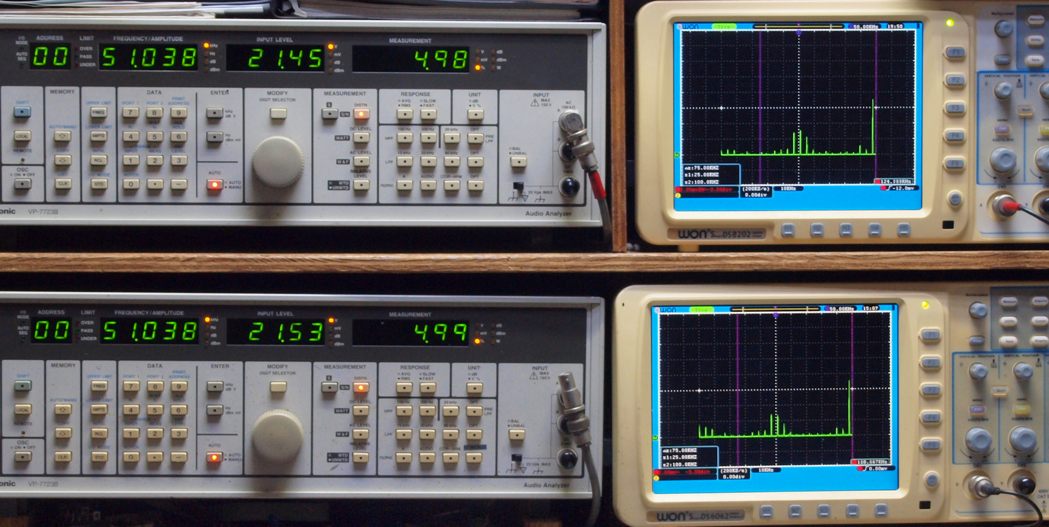 よって、ダイアル設定出力レベルより低なります。測定機器の仕様や整備の様子はこちら、「VP−7723B」「VP−7201A」。 FFT画面の見方はこちら。