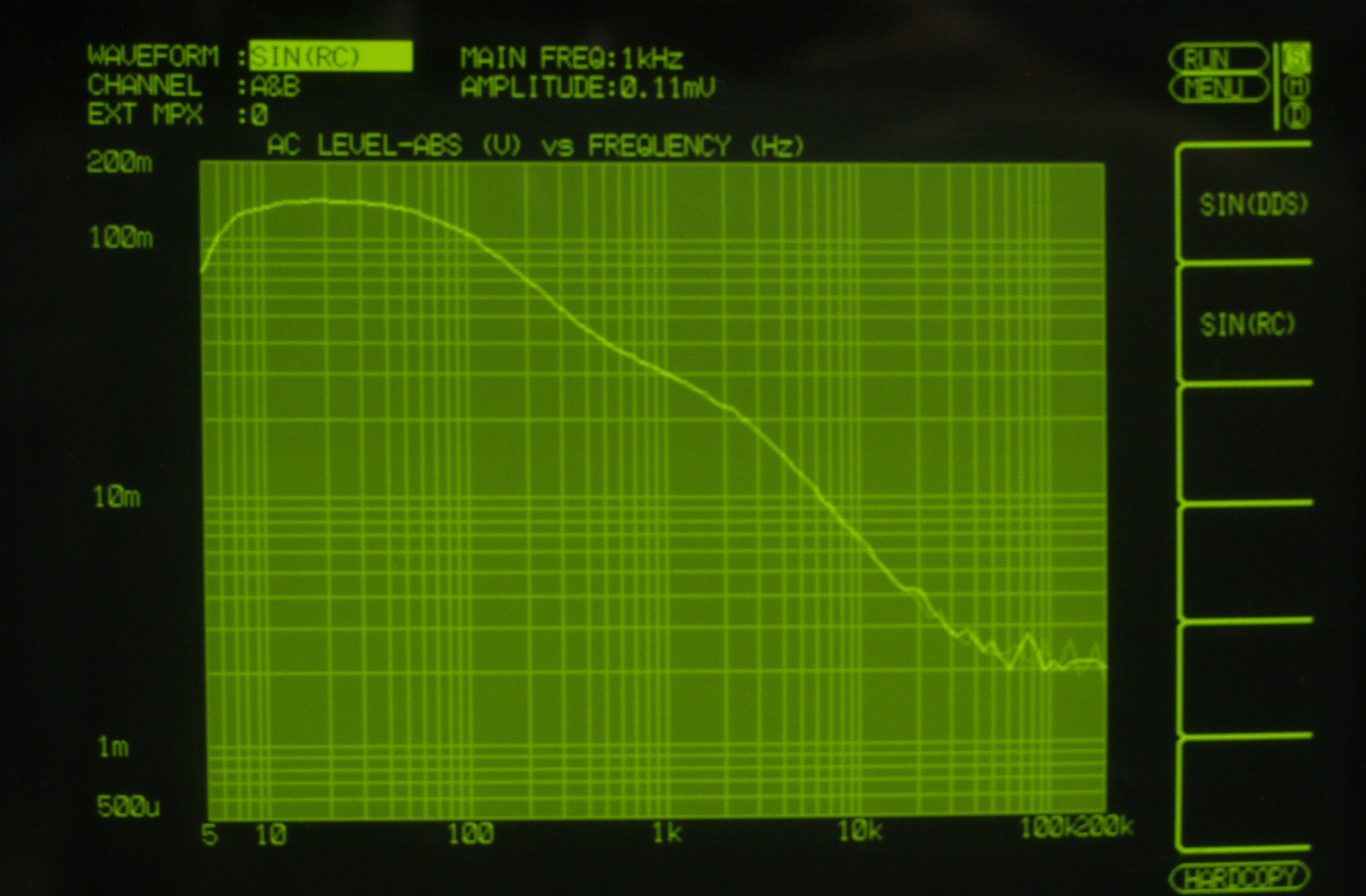 | F1. 入出力特性測定 入力端子へ0.11mV入力 左出力=薄(細い)色 右出力=濃い(太い)色 |