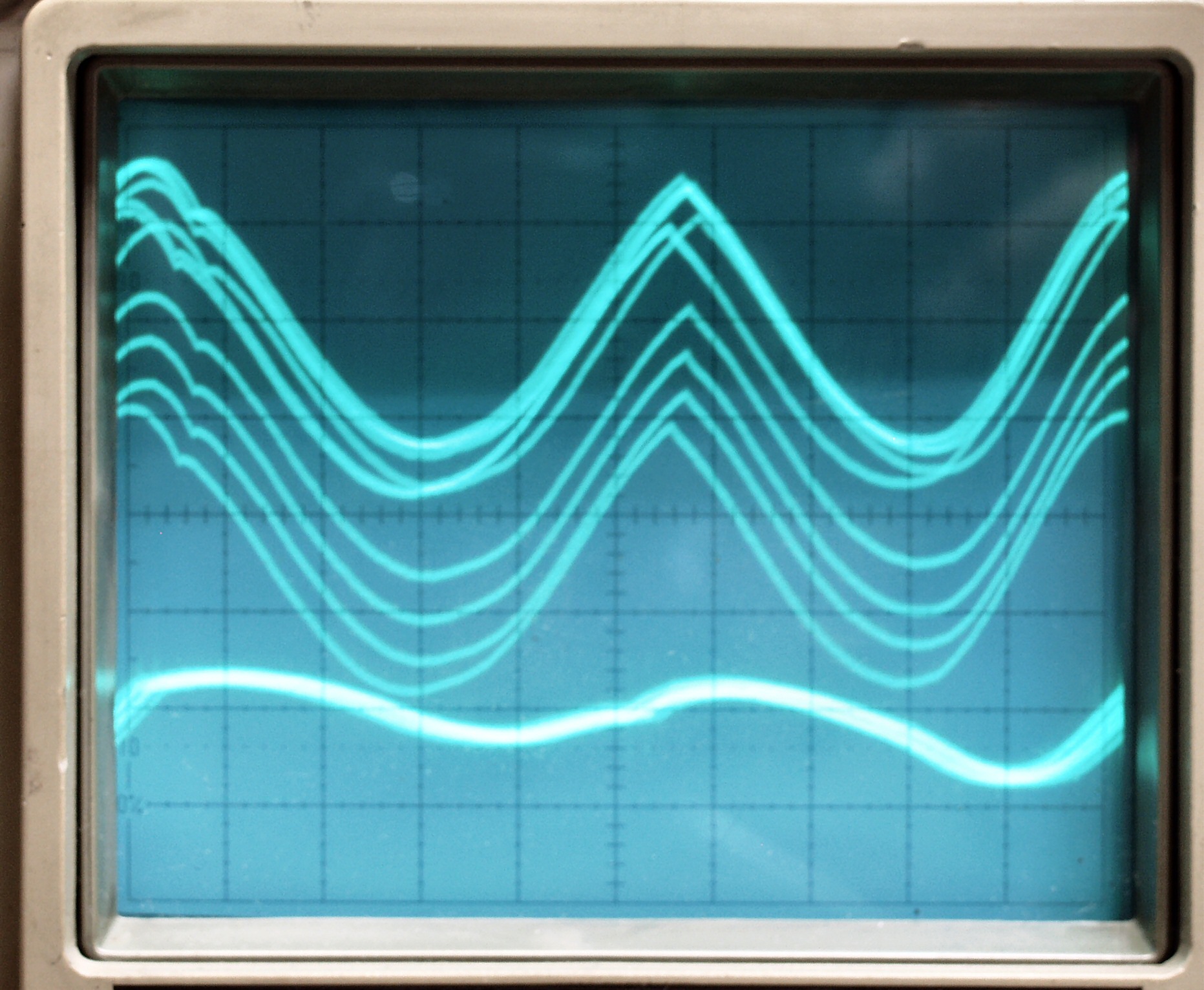 上段右端 オシロ=出力波形 上=R出力、下=L出力(実際にはRL電圧計の出力「Max=1V」を観測)