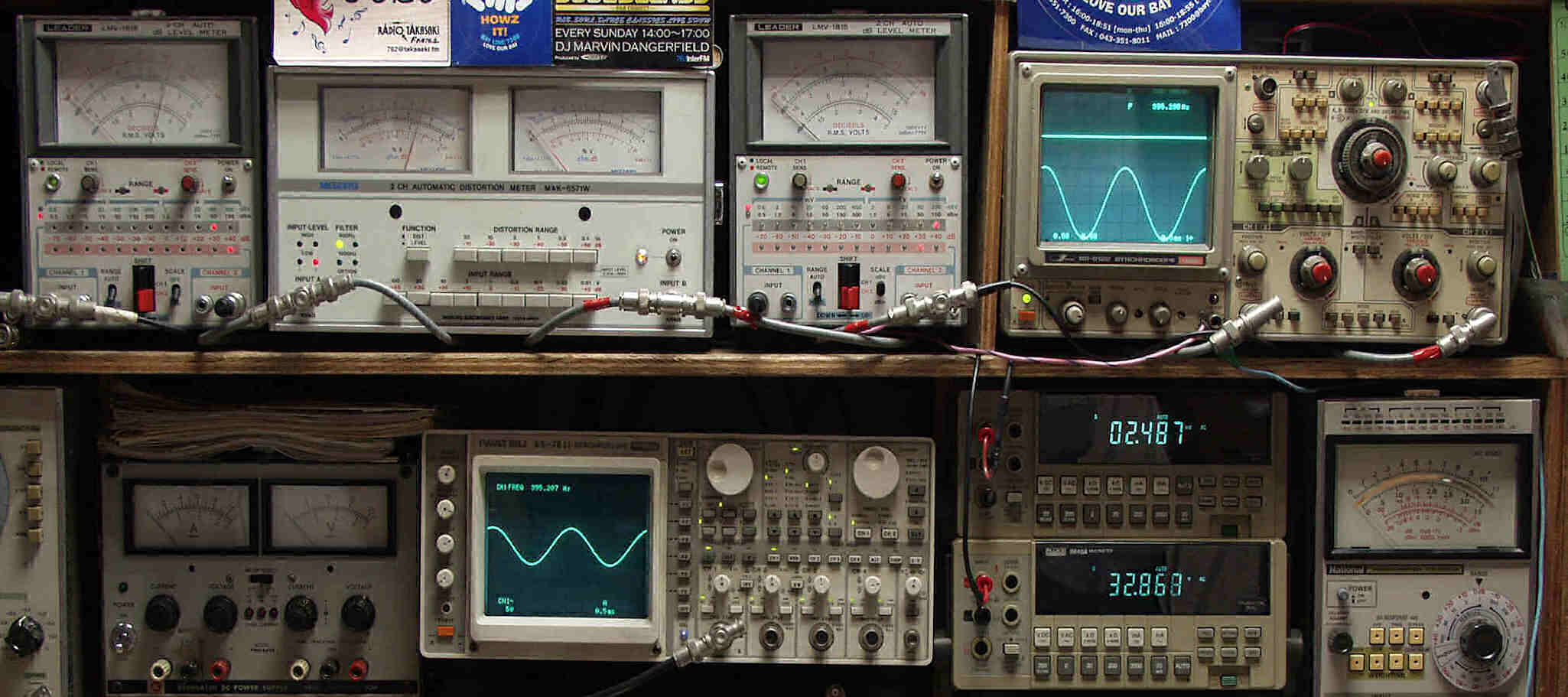 | E. 調整・測定 E1. 出力・歪み率測定 <見方> 下段左端 オーディオ発振器より400HZ・1KHZの信号を出し(歪み率=約0.003%)これをAMPに入力し、出力を測定 下段中左 オシロ=入力波形(オーディオ発振器のTTLレベル) 下段中右上=周波数計 上段左端 電圧計=L側出力電圧測定、黒針のみ使用 上段中左 歪み率計=出力の歪み率測定 左メータ=L出力、右メータ=R出力 上段中右 電圧計=R側出力電圧測定、赤針のみ使用 上段右端 オシロ=出力波形 上=R出力、下=L出力(実際にはRL電圧計の出力「Max1V」を観測) 下段中右上 デジタル電圧計=R出力電圧測定 下段中右下 デジタル電圧計=L出力電圧測定 |