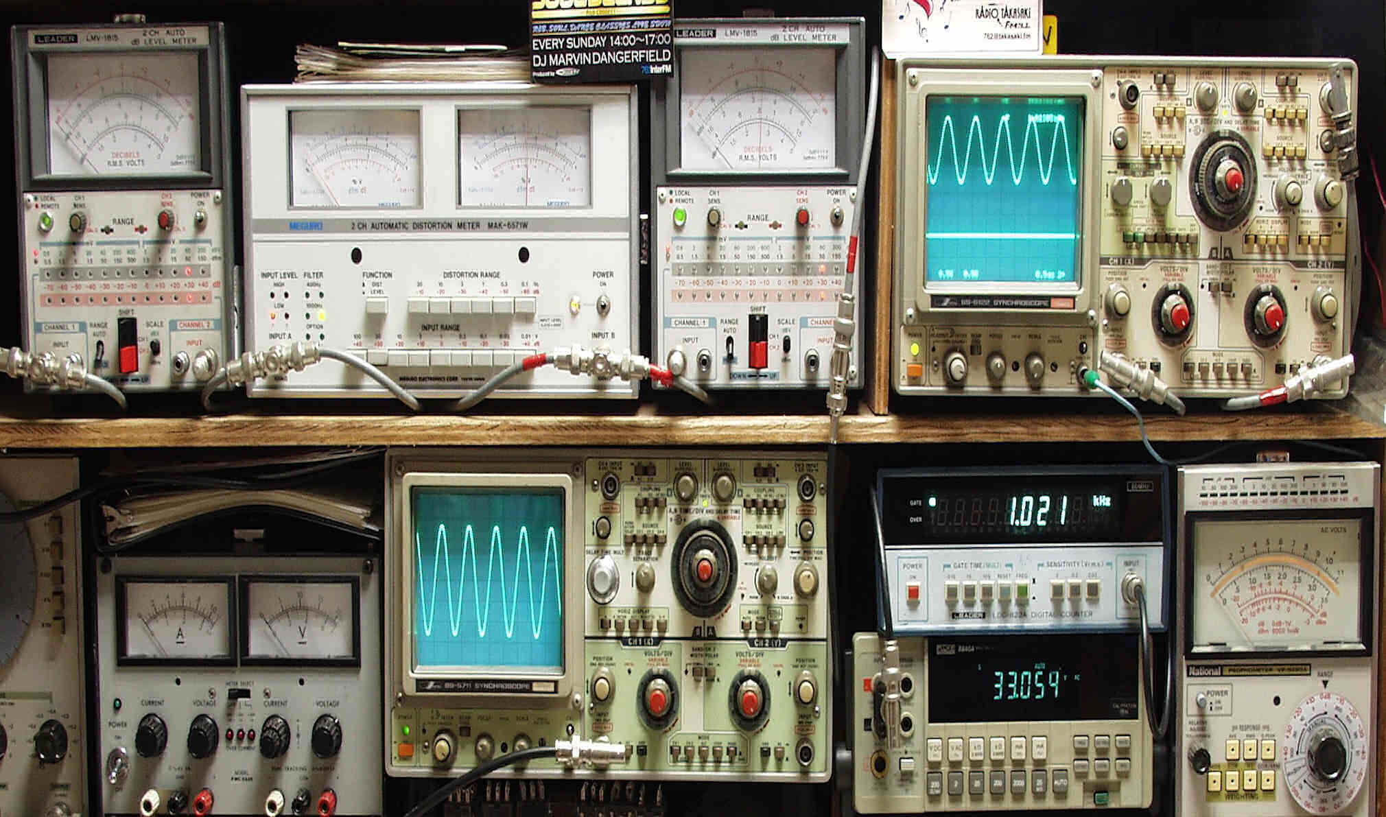 | E. 調整 E1. 歪み測定・調整(SP出力インピーダンスは8オームです) <見方> 下左オーディオ発振器より400HZ・1KHZの信号を出し(歪み率=約0.003%)これをAMPに入力し、SPからの出力を測定。 下中のオシロ=入力波形(オーディオ発振器のTTLレベル)。 下右上の周波数計=入力周波数測定。 上左端の電圧計=L側SP出力電圧測定。 黒針のみ使用 上中左の歪み率計=SP出力の歪み率測定。 左メータ=L出力。 右メータ=R出力 上中右の電圧計=R側SP出力電圧測定。 赤針のみ使用 上右端のオシロ=SP出力波形。 上=R出力。 下=L出力 下中右上のデジタル電圧計=SP出力電圧測定。RLは切り替えて測定 |