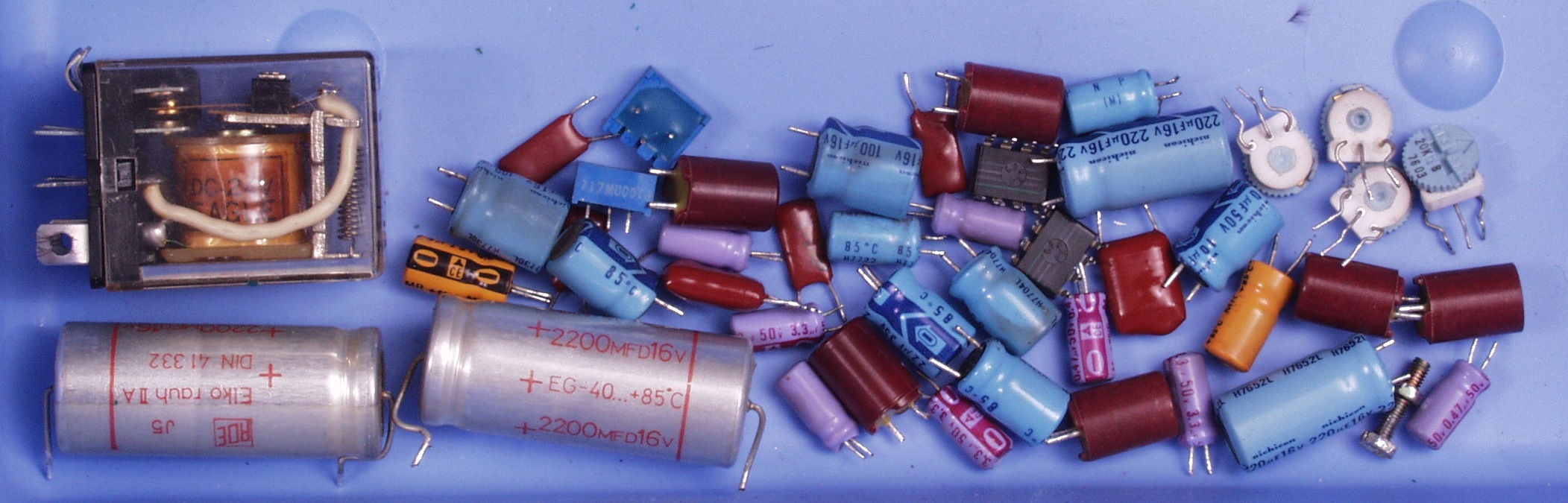 | C6B. 修理後 SP接続リレー・温度感知サーミスター。 SP接続リレー交換、電解コンデンサー2個、フイルムコンデンサー2個追加。 |