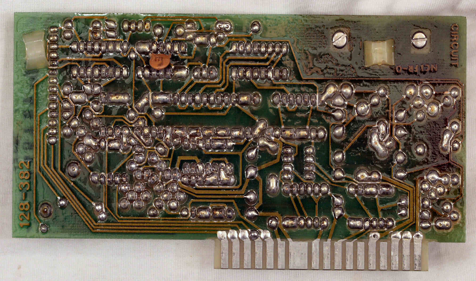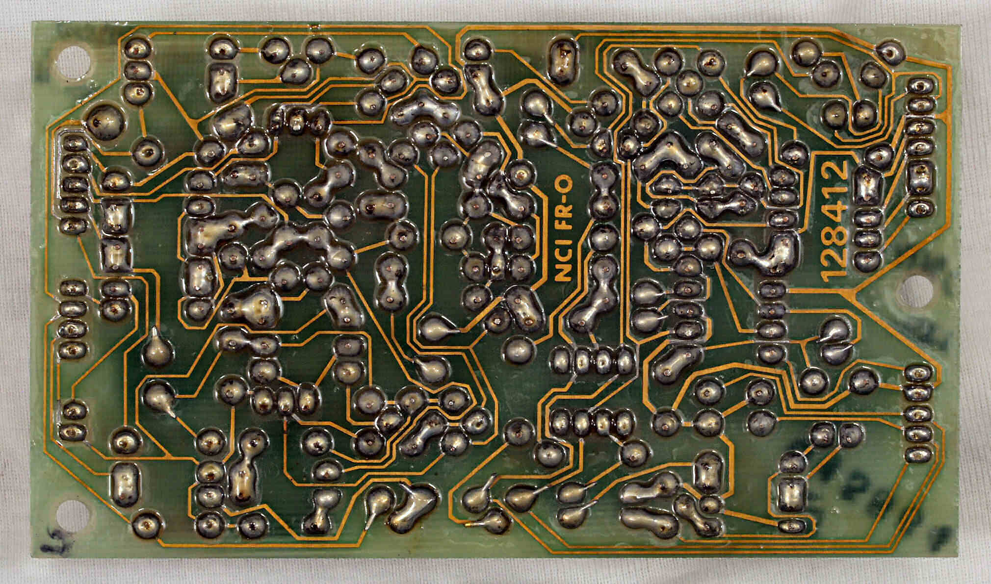 | C44. 修理(半田補正)後 VU−AMP基板裏。 基板銅箔を補修し、全半田やり直す。 | ||||||||||||||||||||||||||||||||||