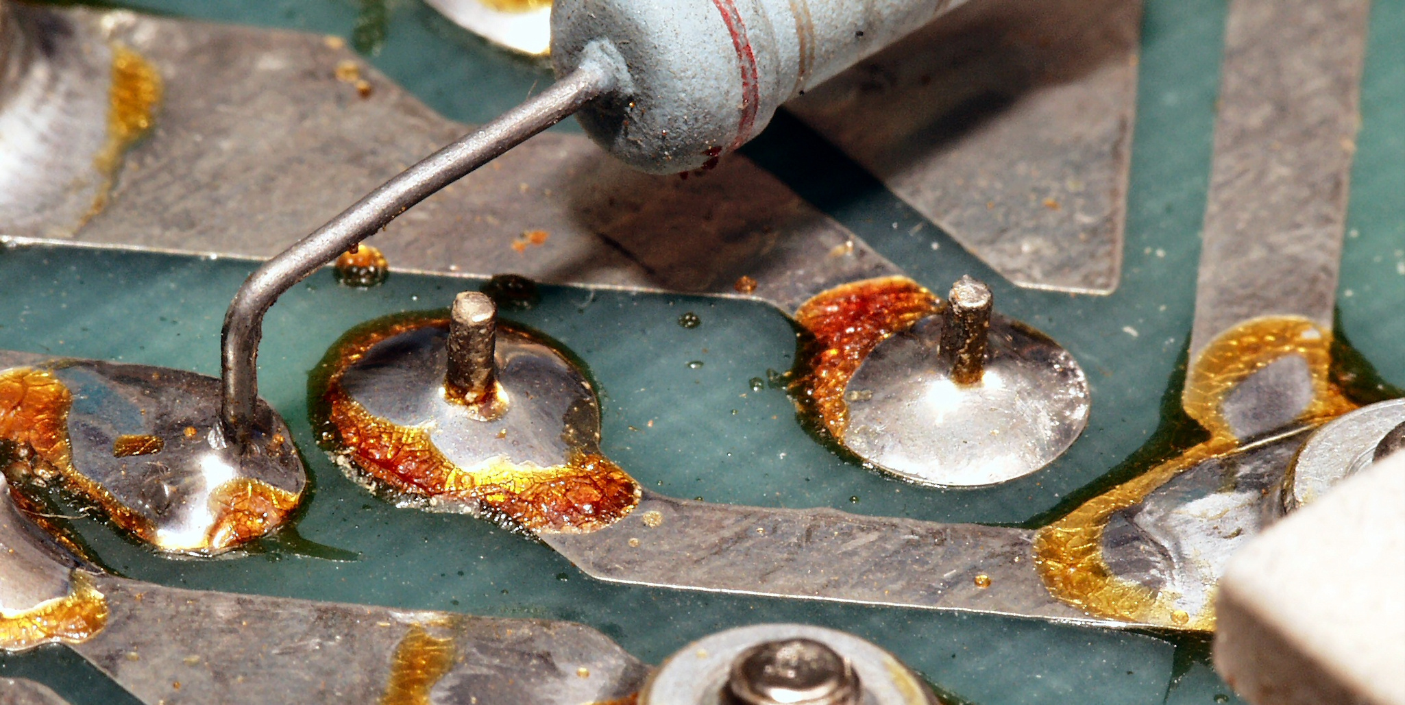 | C58. 修理中 R「−」側−終段TR(トランジスター)基板裏。 終段TR(トランジスター)の足の半田、もう少し半田の糊代が欲しい! | ||||||||||||||||||||||||||