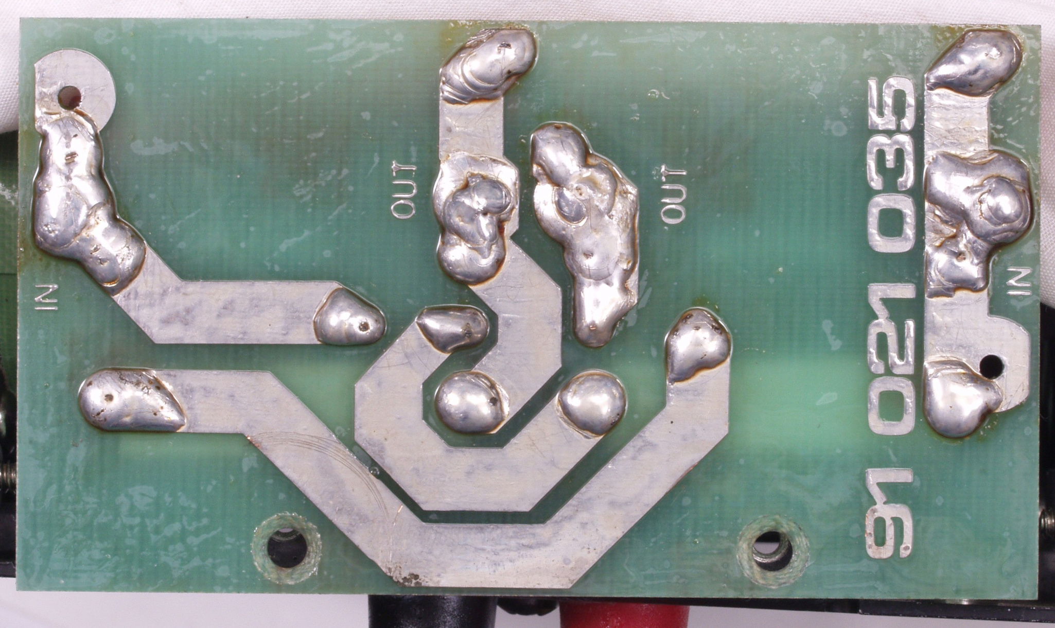 | C63. 修理中 L「+」側−終段TR(トランジスター)基板裏。 終段TR(トランジスター)の足の半田、もう少し半田の糊代が欲しい! | ||||||||||||||||||||||||||