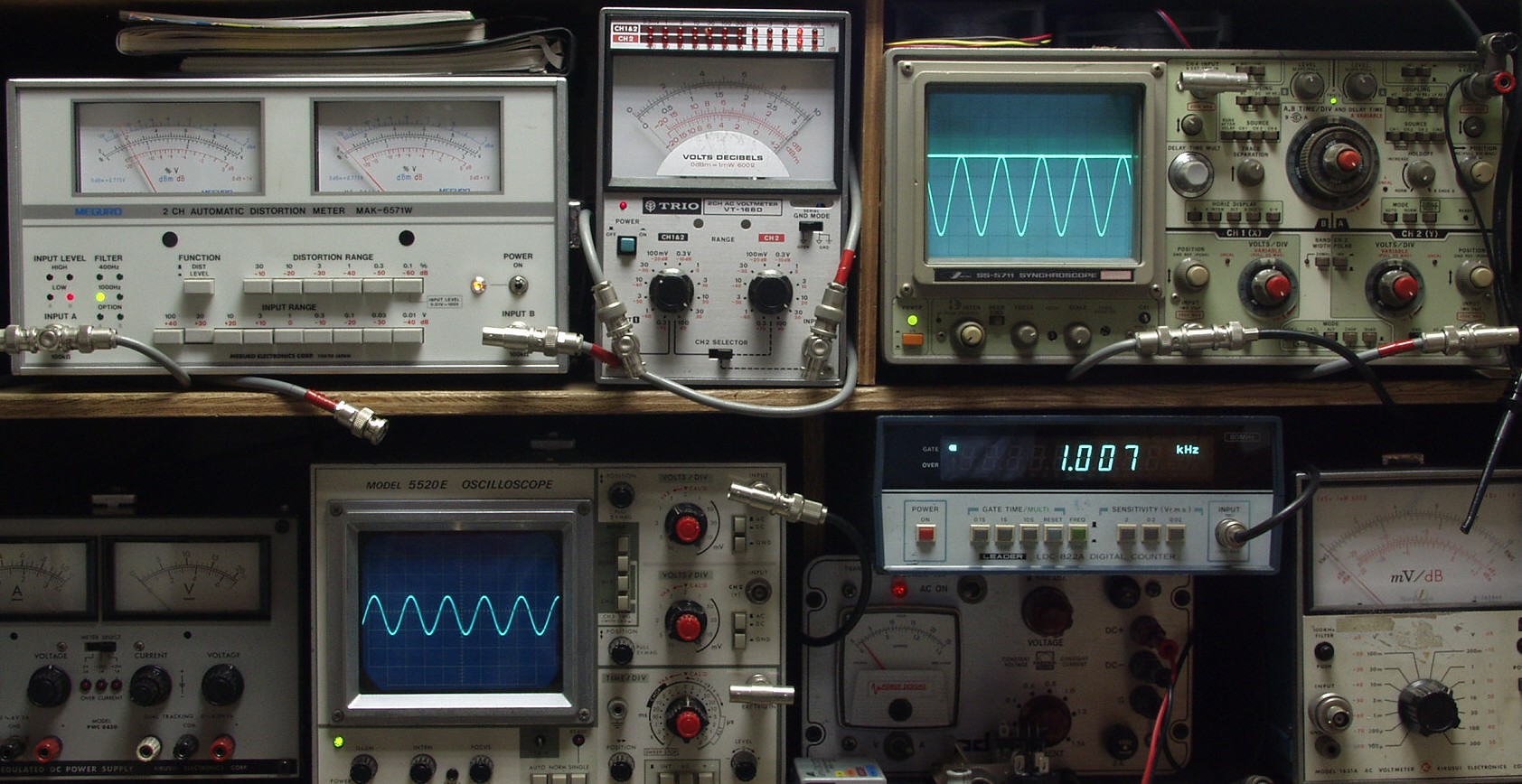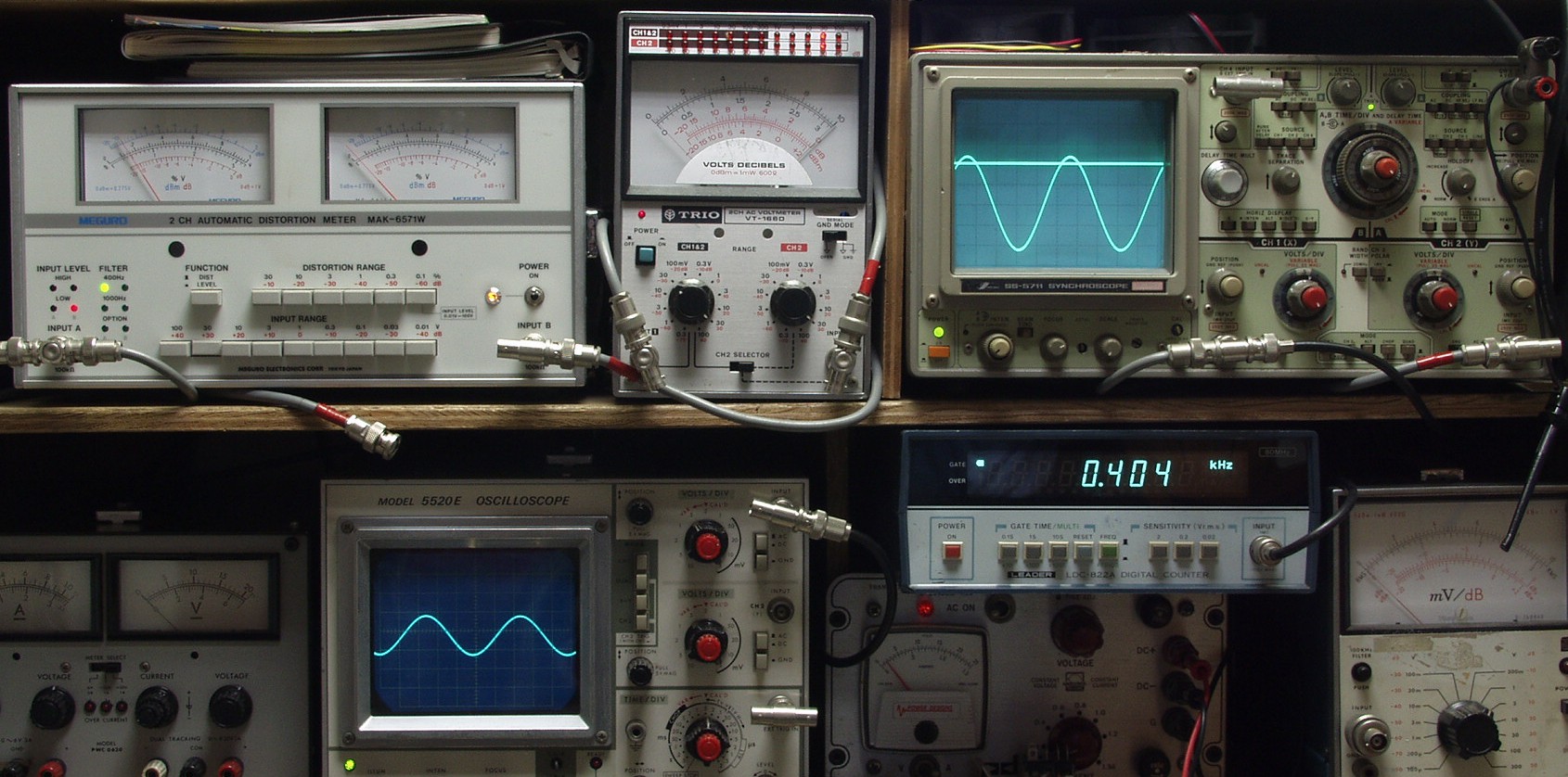 | E. 調整・測定 E1. 出力/歪み率測定・調整 <見方> 下左オーディオ発振器より400HZ・1KHZの信号を出す(歪み率=約0.003%) 下中=入力波形(オーディオ発振器のTTLレベル) 下右=周波数計 上左=SP出力の歪み率測定 左メータ=L出力、右メータ=R出力 上中=SP出力電圧測定器、赤針=R出力、黒針=L出力 上右=SP出力波形オシロ 上=R出力、下=L出力(出力電圧測定器の出力) |