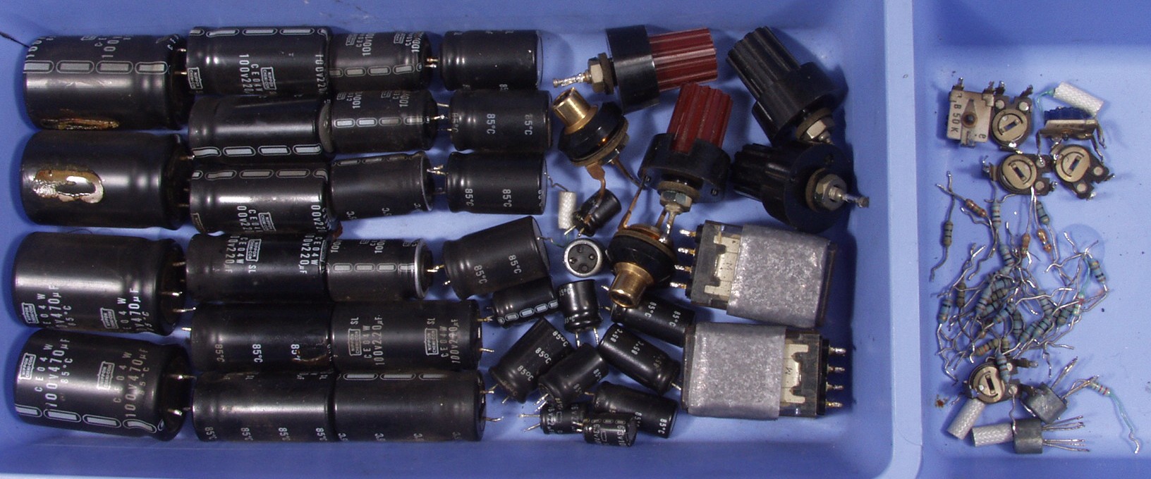| A2. 点検中 電解コンデンサーの頭のビニールが剥けている、初段FETAMPのシールドケースに鉛が貼ってある |