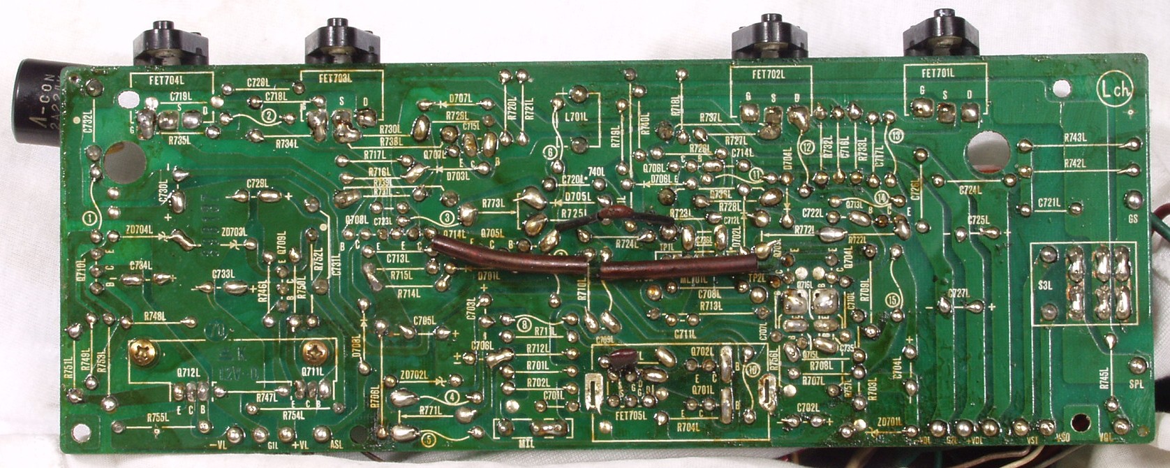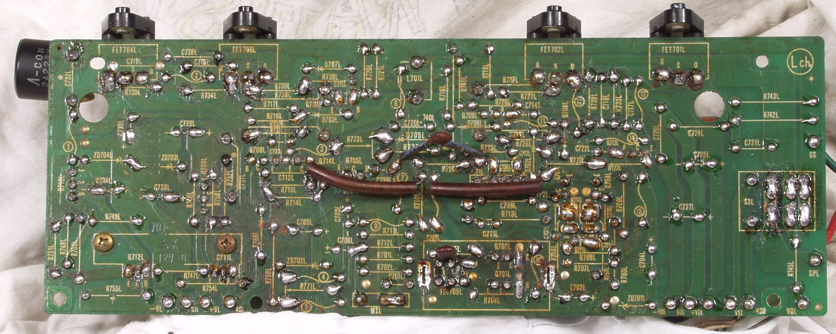 | C2E. 修理完成後 Lドライブ基板裏 不要なフラックスを削り落とし、洗浄後。 「フラックス」=半田を付ける為に、事前に塗る物、松ヤニが元祖ですが、現在は化学合成が殆ど |