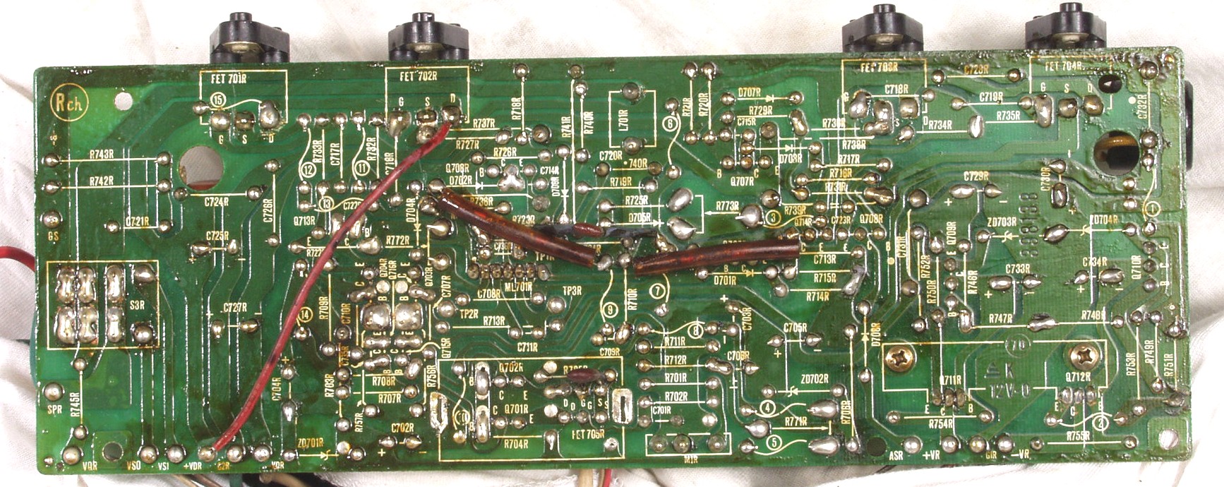 | C1E. 修理完成後 Rドライブ基板裏 不要なフラックスを削り落とし、洗浄後。 「フラックス」=半田を付ける為に、事前に塗る物、松ヤニが元祖ですが、現在は化学合成が殆ど |