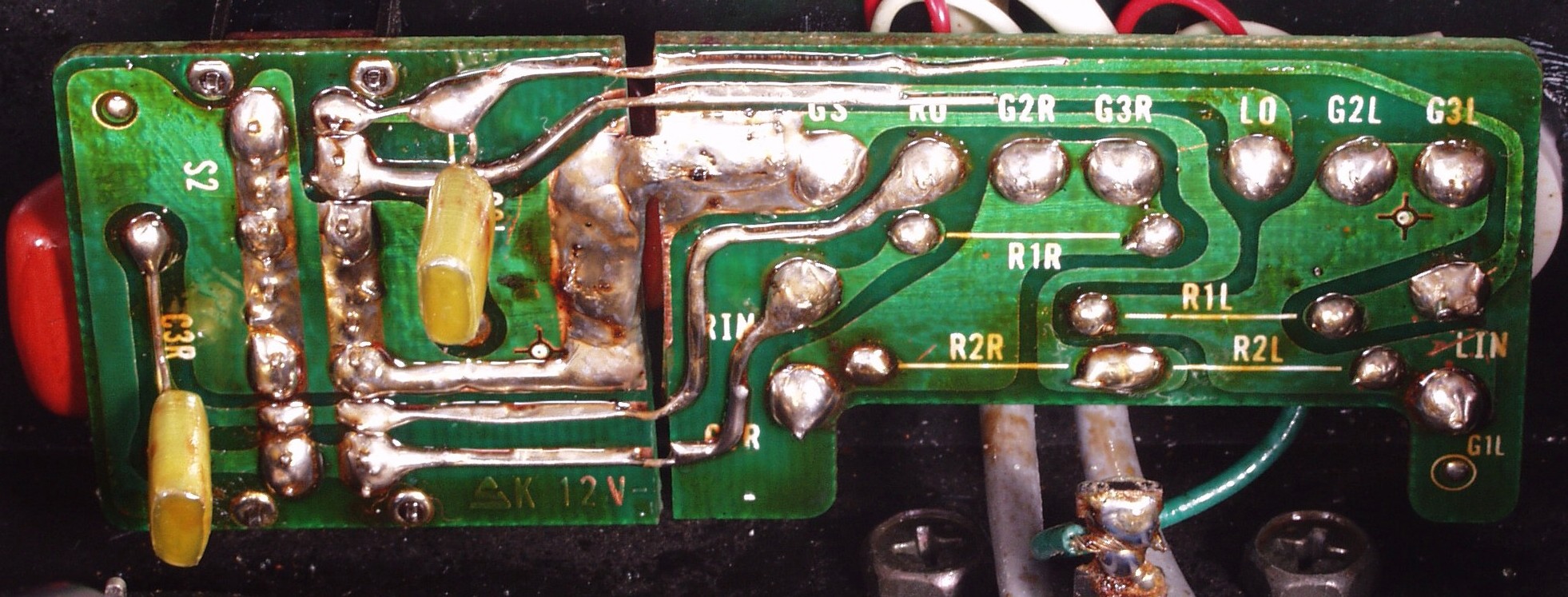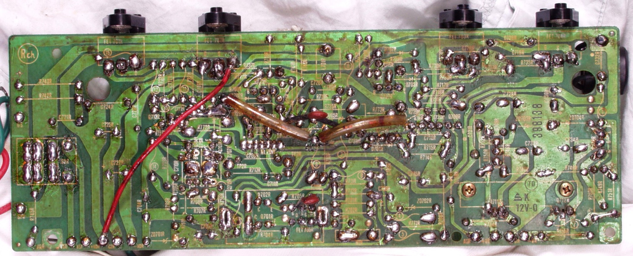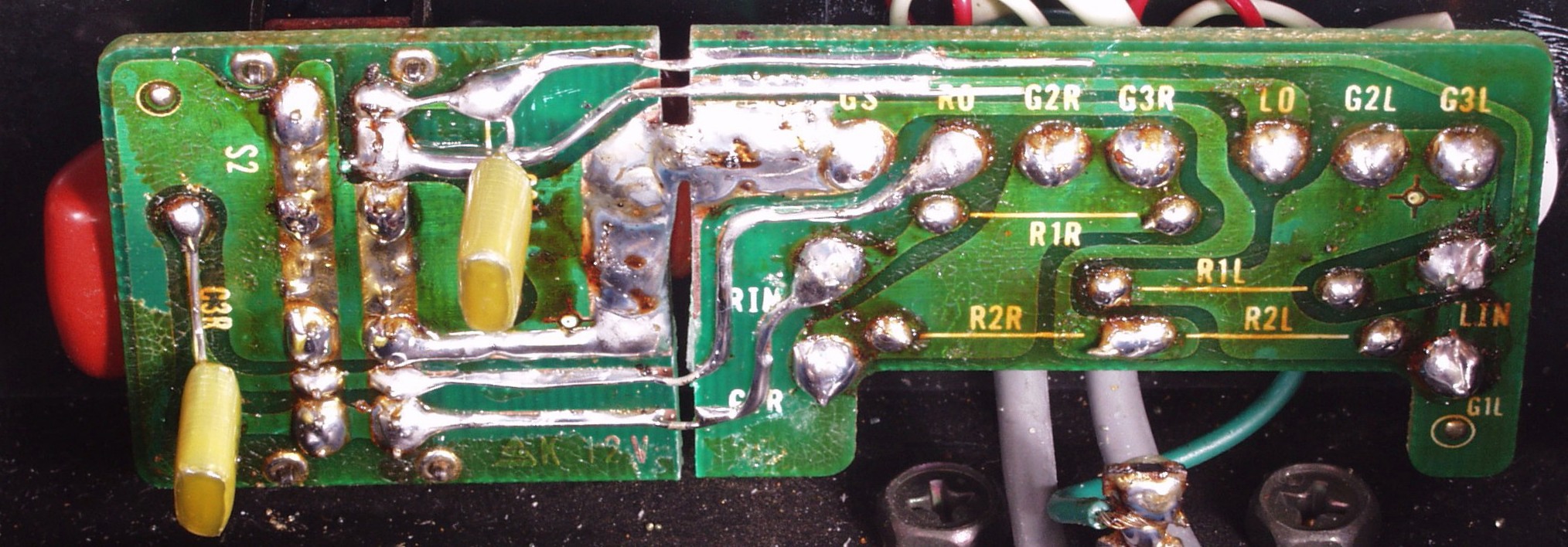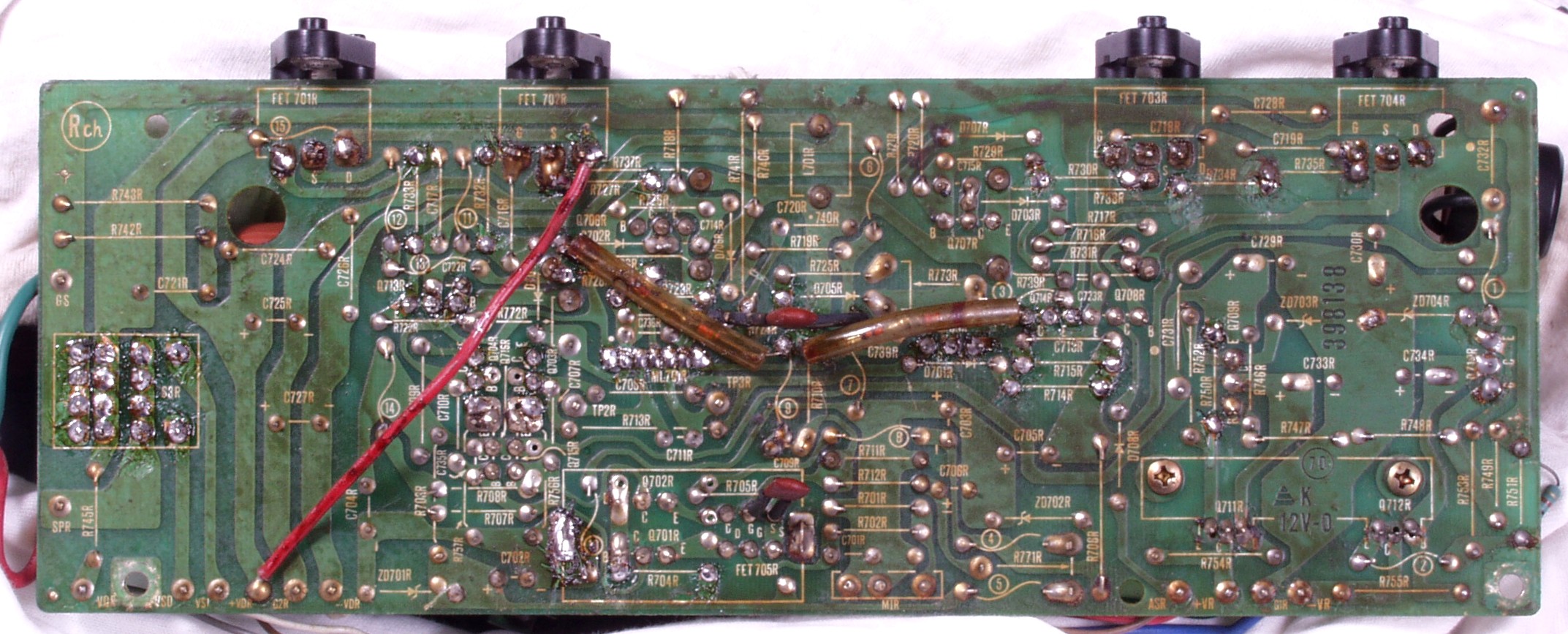 | C1C2. 修理中 Rドライブ基板裏 前回の修理で銅箔剥離が起こしている、未熟な腕の為! |