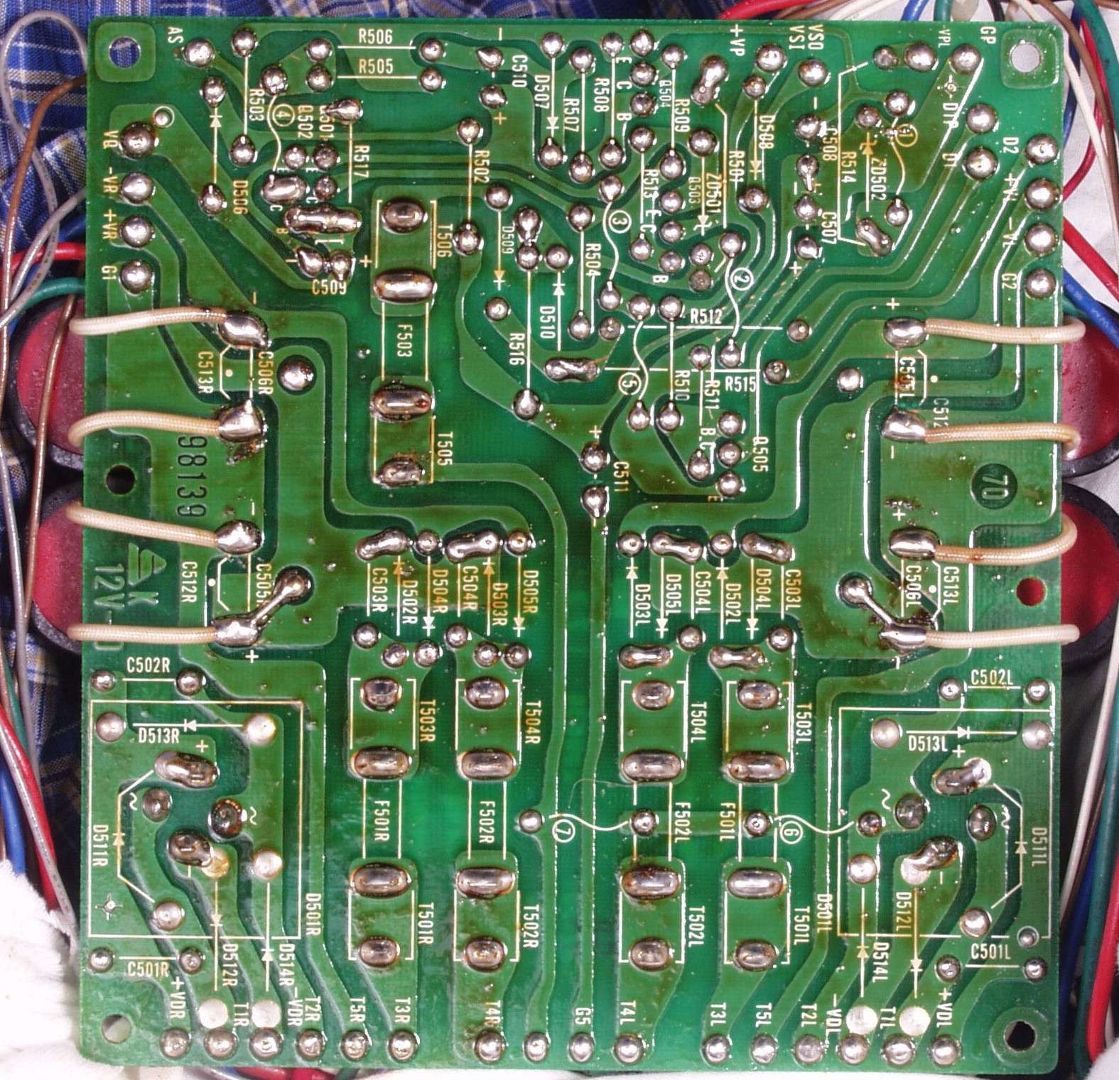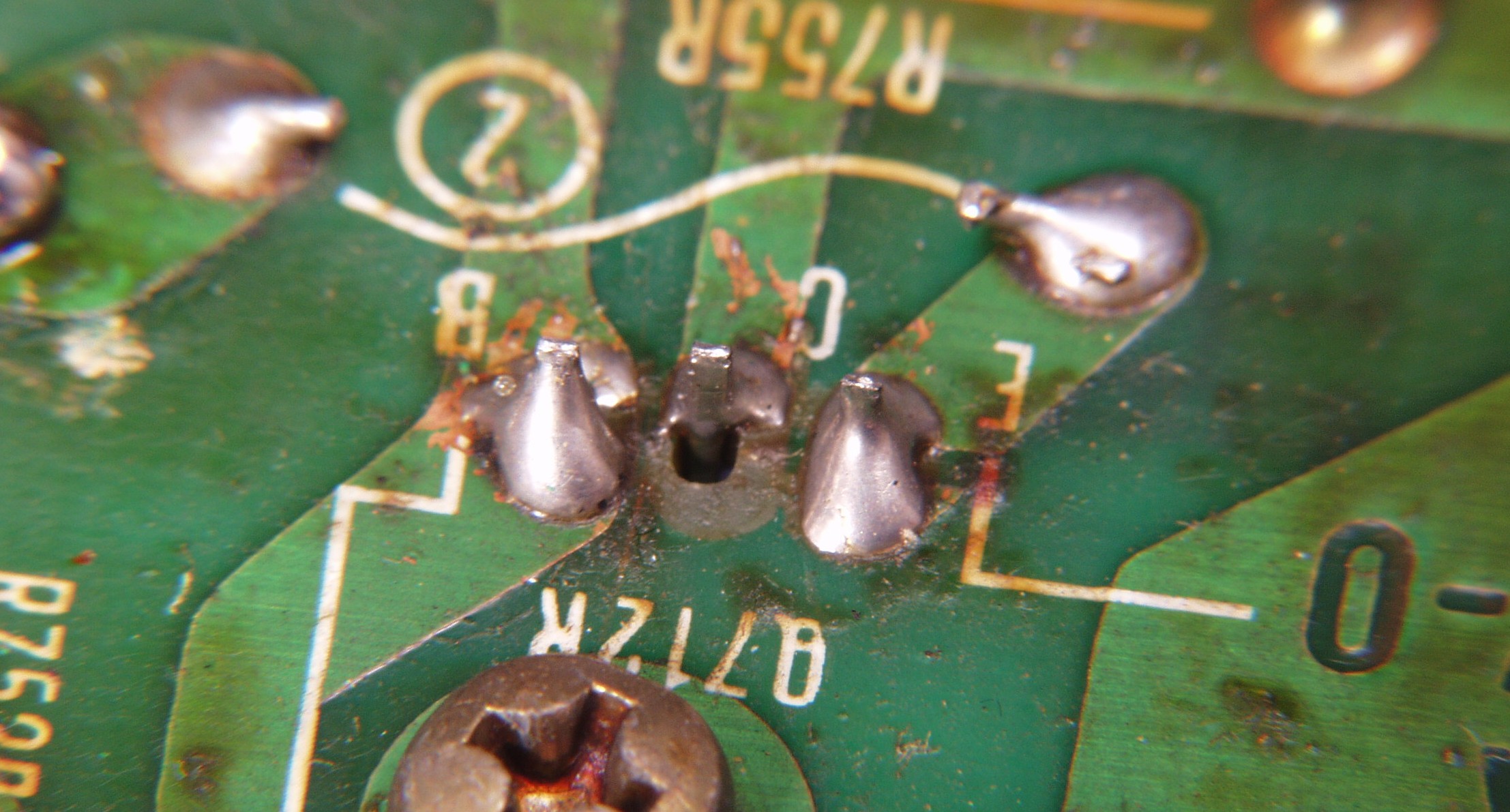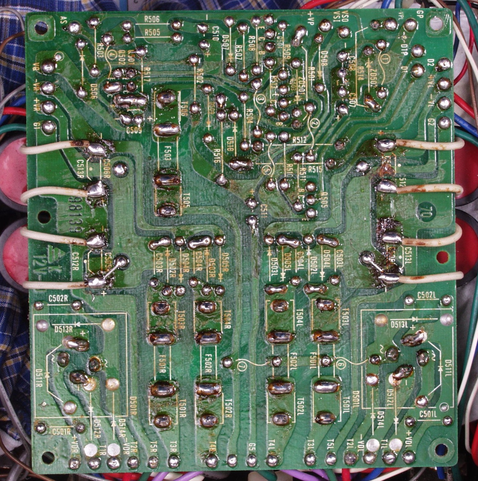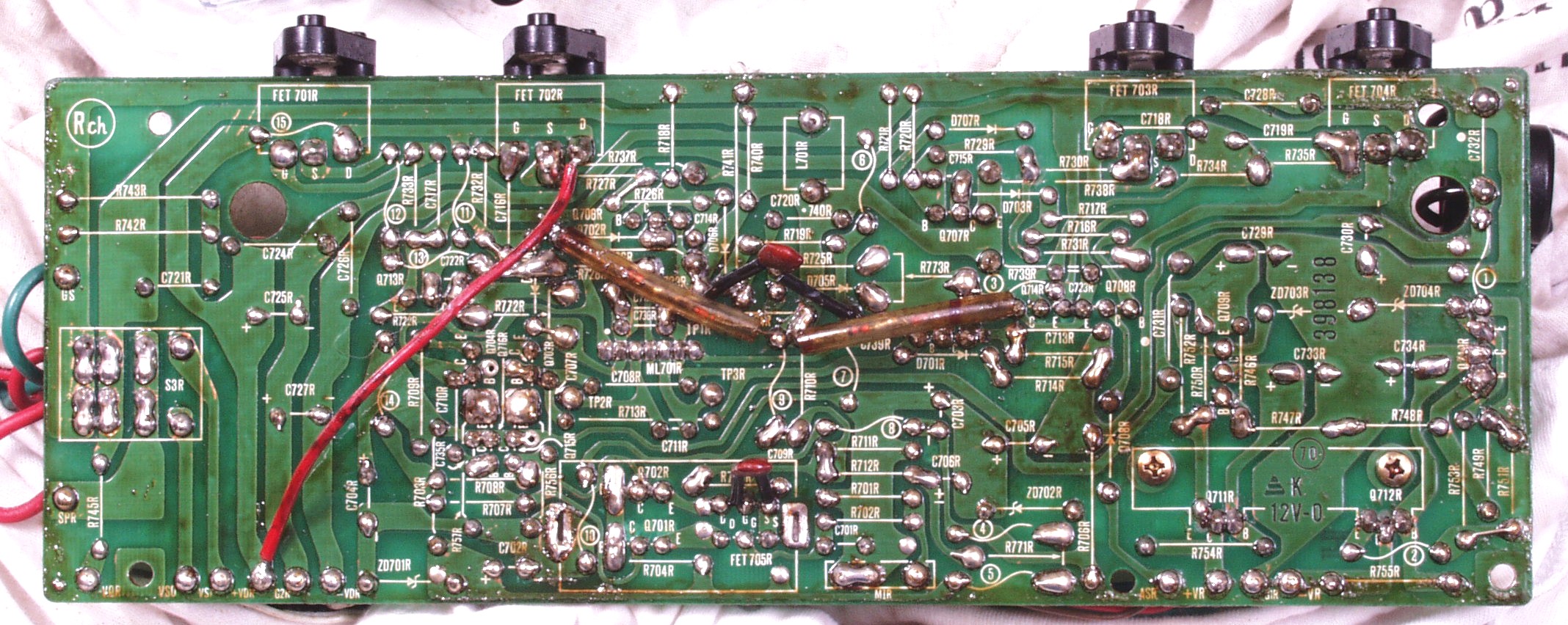 | C1C2. 修理中 Rドライブ基板裏 前回の修理で銅箔剥離が起こしている、未熟な腕の為! |