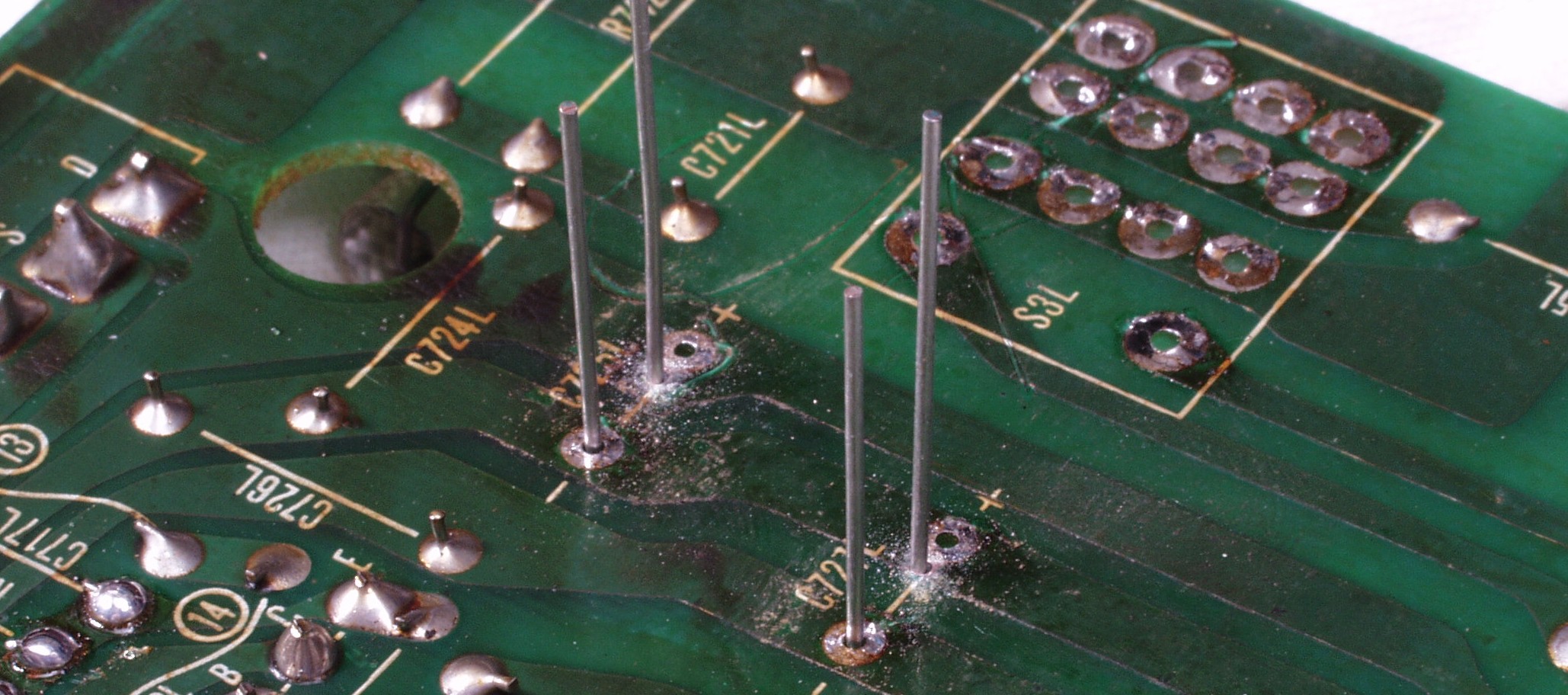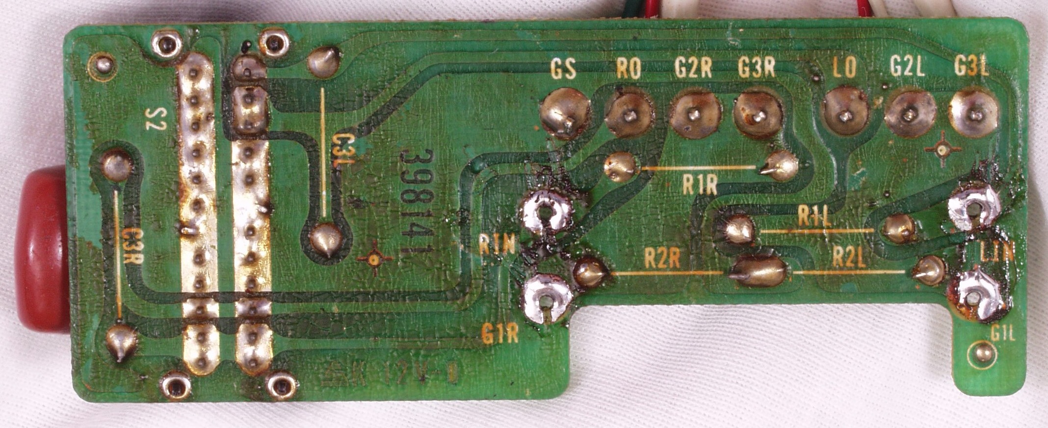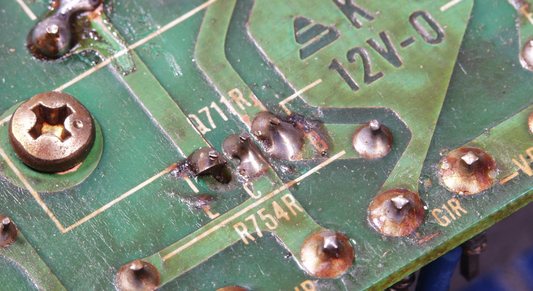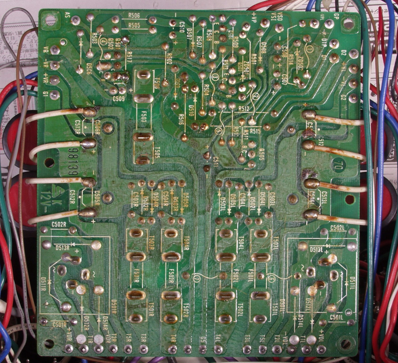 | C1C2. 修理中 Rドライブ基板裏 前回の修理で銅箔剥離が起こしている、未熟な腕の為! |